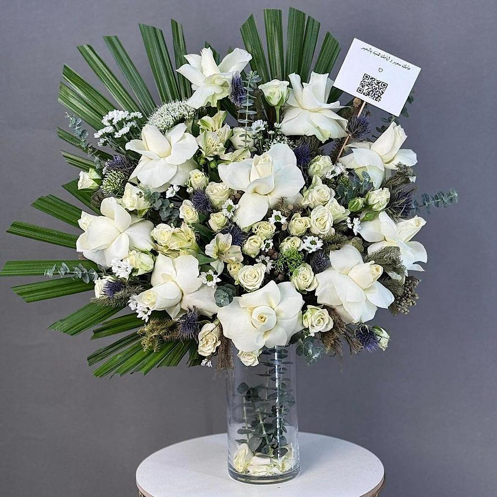 تحتوي هذه الفازة على الجوري، مرتبة بطريقة فريدة، إلى جانب زهور الياسمين الأخضر وزهور البيبي جوري البيضاء.