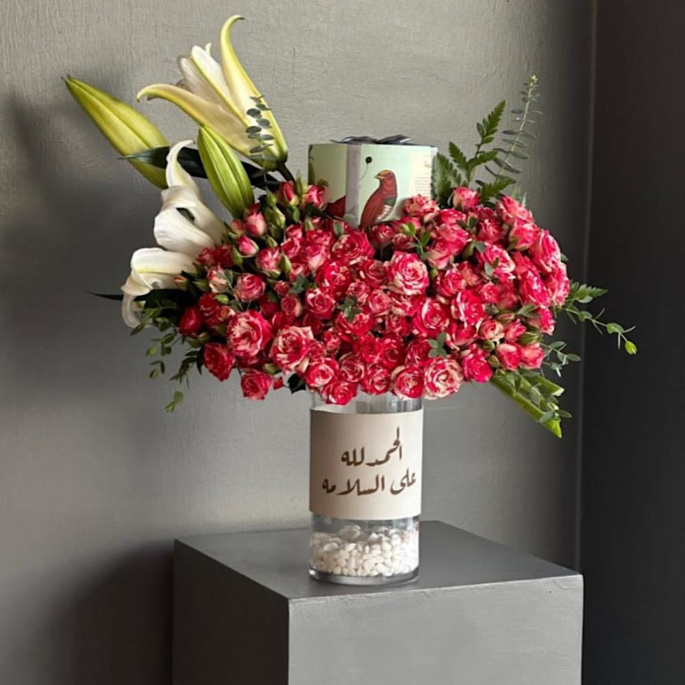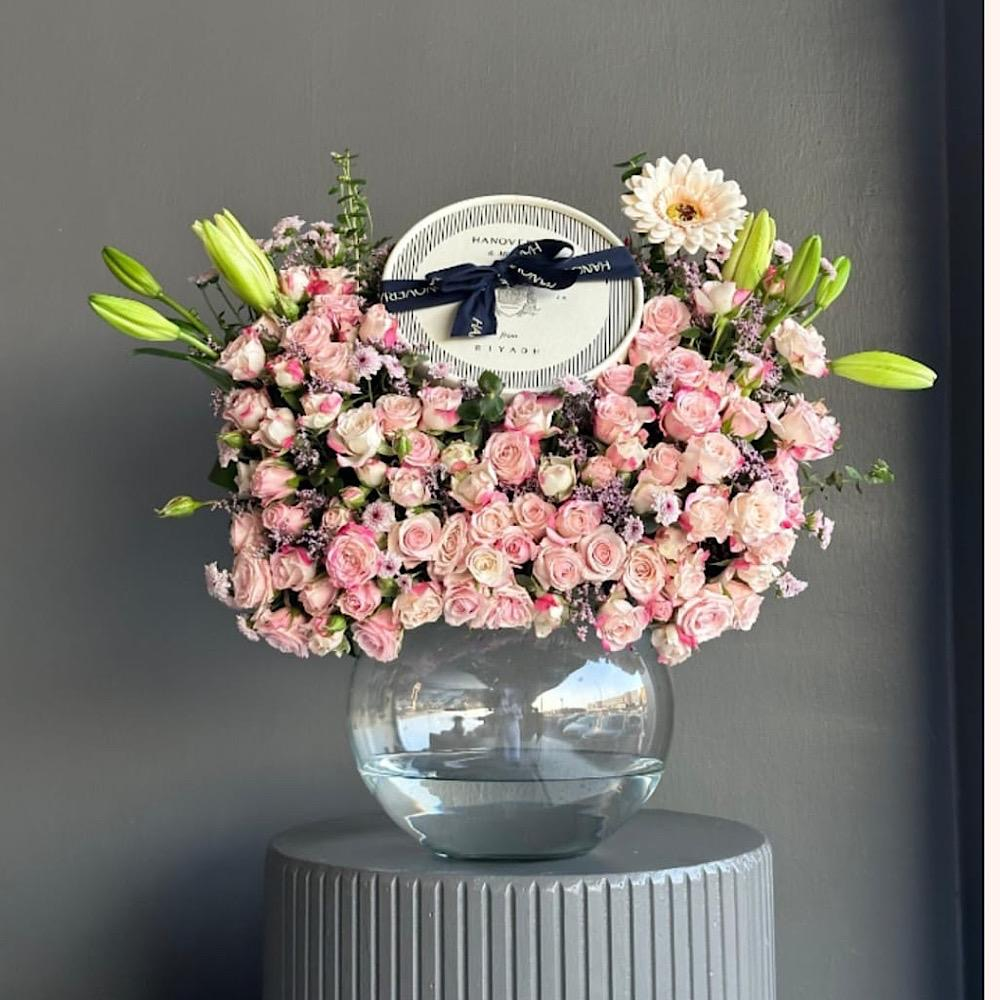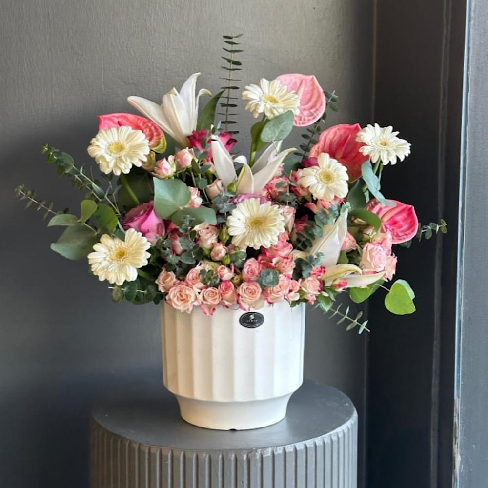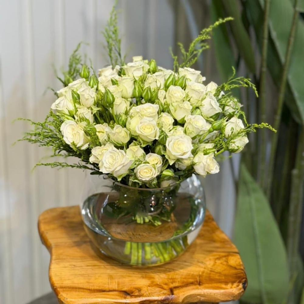 فازة مليئة بأزهار البيبي روز الأنيقة.
