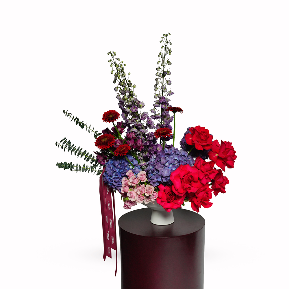 فازة تحتوي على الجوري، الجيربيرا، الالستروميريا، الهايدرنجا والدلفينيوم.