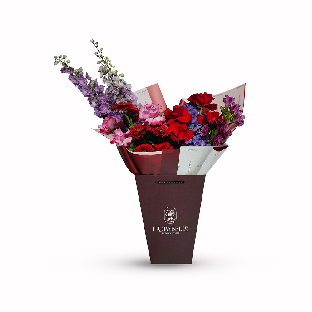 باقة يد تحتوي على الجوري، الجيربيرا، الهايدرنجا والدلفينيوم.