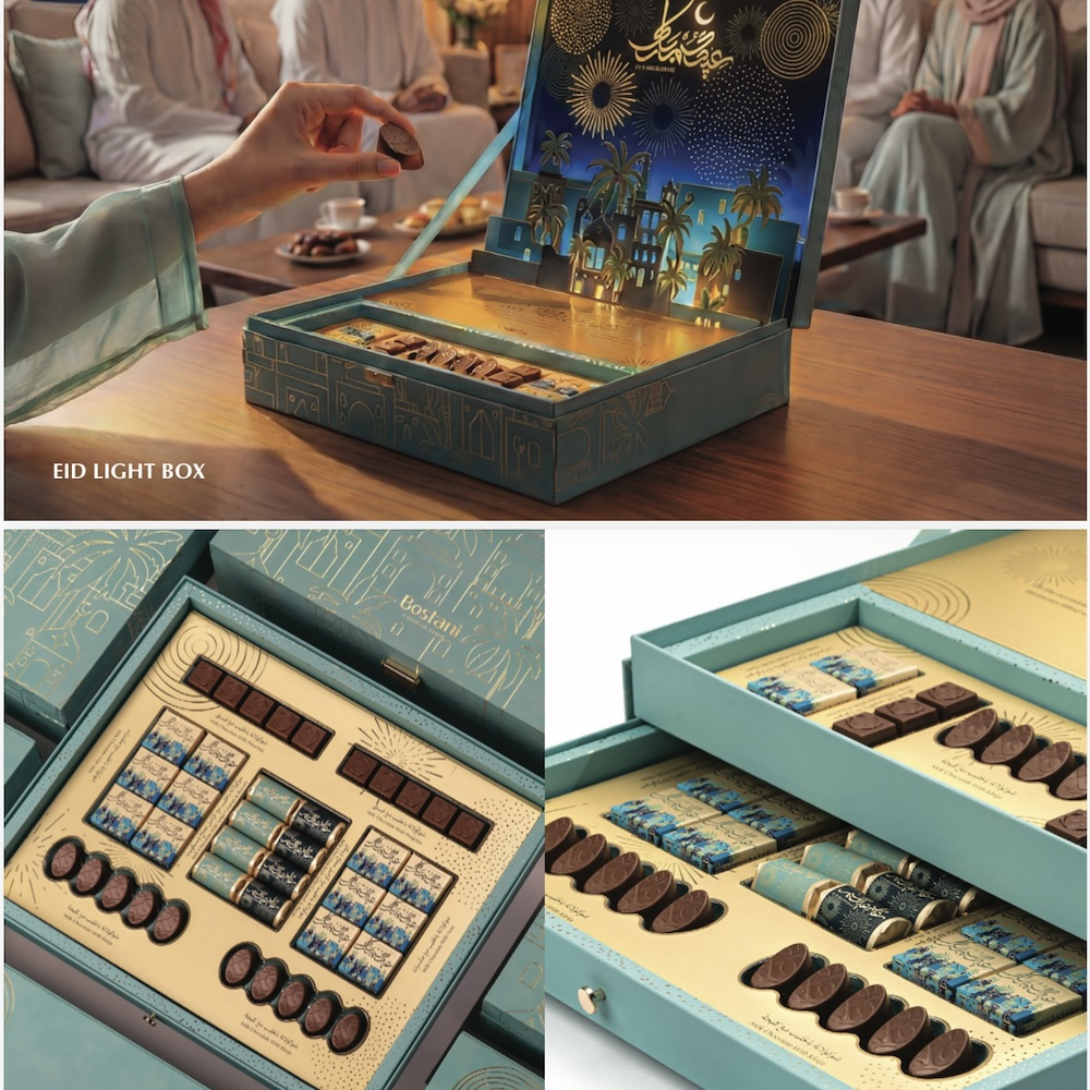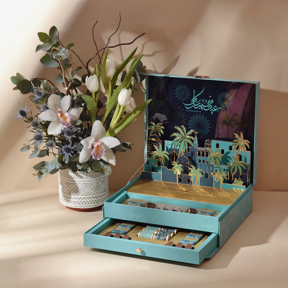 باقة تحتوي على زهور التوليب والأوركيد مع علبة شوكولاتة من بستاني.