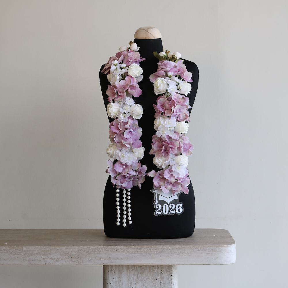 قلادة أزهار تحتوي على أزهار صناعية، مع تغريسة تخرج.