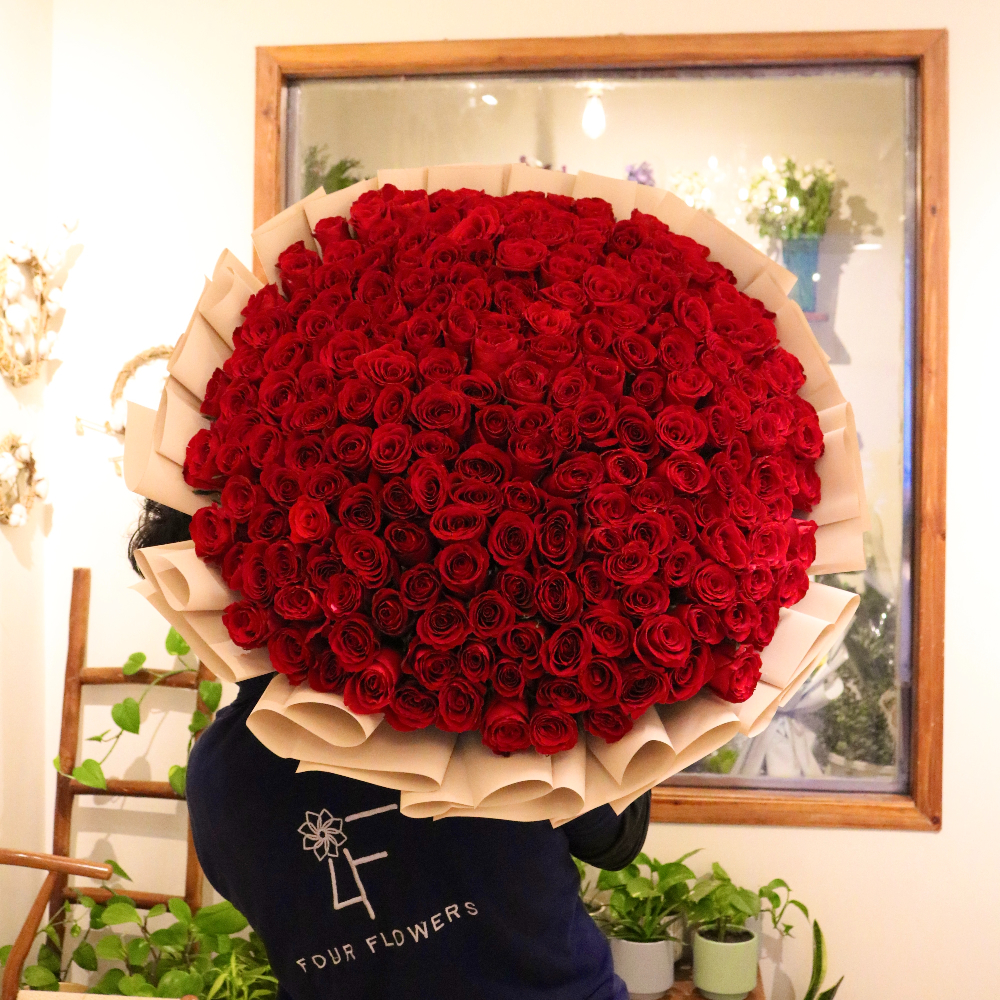 باقة بقاعدة تحتوي على 200 زهرة من الجوري باللون الأحمر.