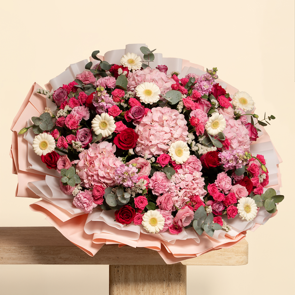 باقة فاخرة بقاعدة فلين للمحافظة على الزهور لتعيش عمر أطول، مكونة من أجمل أنواع زهور الجوري، البيبي جوري، الجيربيرا، الكارنيشن، الماثيولا والهايجدرينجا الهولندية، منسقة بشكل جميل ومناسبة كهدية مميزة لعيد ميلاد، حفل زفاف، ذكرى سنوية أو اي مناسبة.