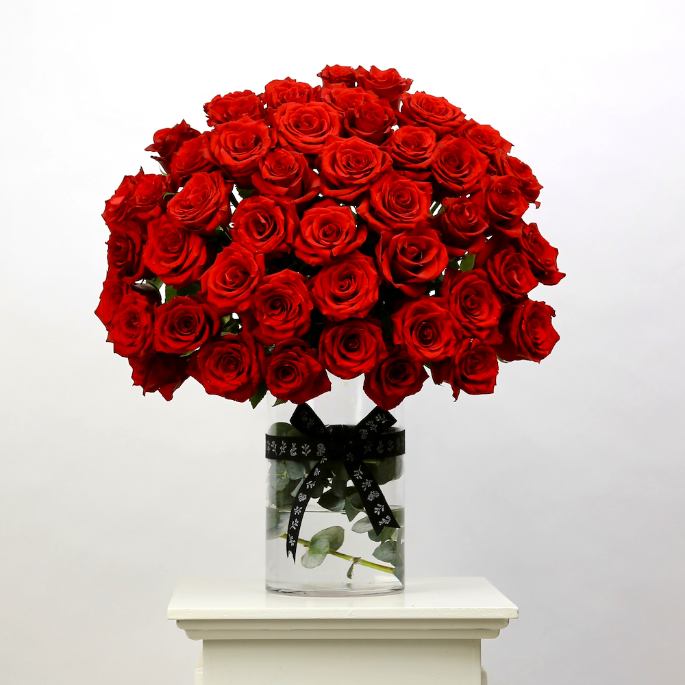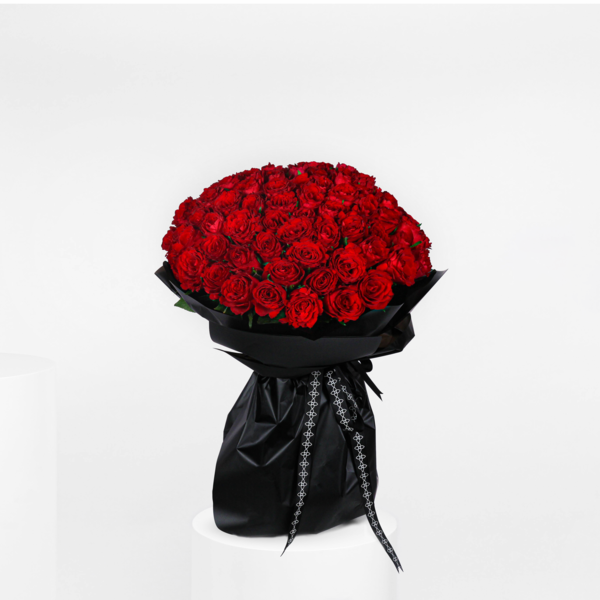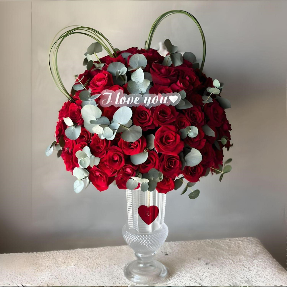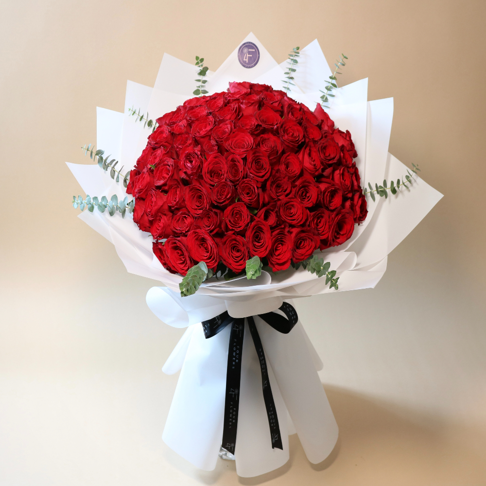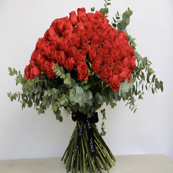 باقة يد كبيرة فاخرة بقاعدة تحتوي على 100 زهرة جوري.