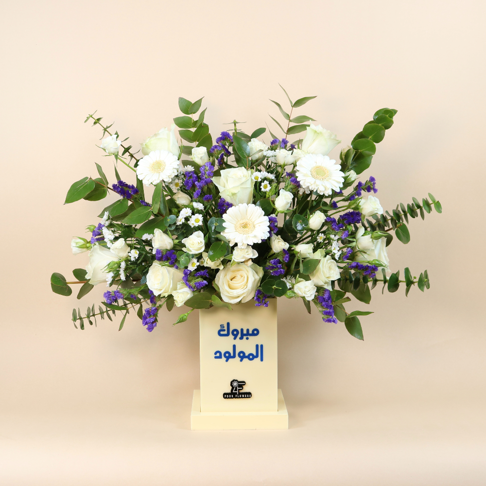 صندوق يحتوي على الجوري، البيبي جوري، الجيربيرا، الستاتس واليوكالبتوس.