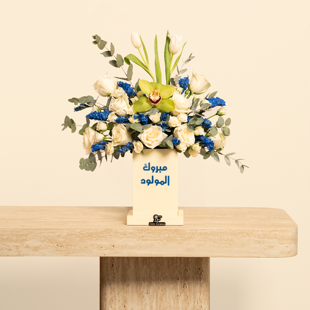 فازة تحتوي على 250 جرام من شوكولاتة باتشي مع أزهار الجوري الفاخرة والسمبيديوم.