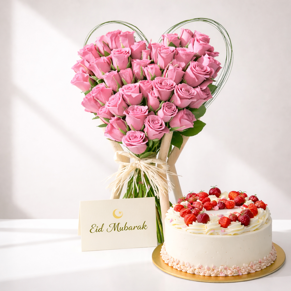 باقة يد تحتوي على زهور الجوري الوردية، مرتبة بشكل جميل. تأتي مع كيكة.