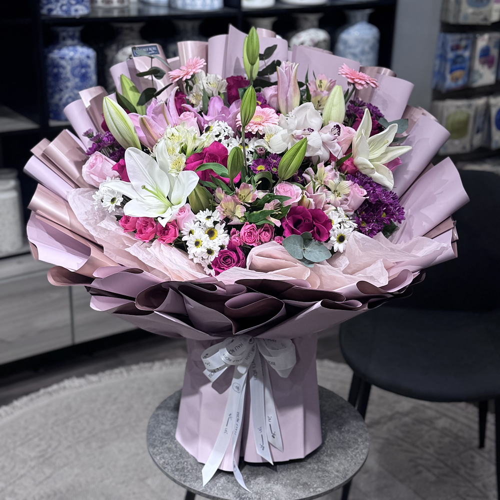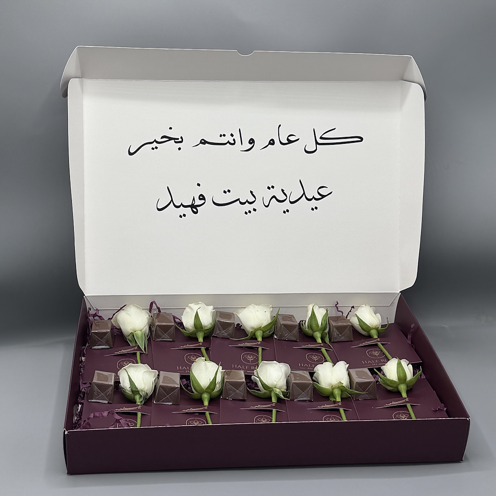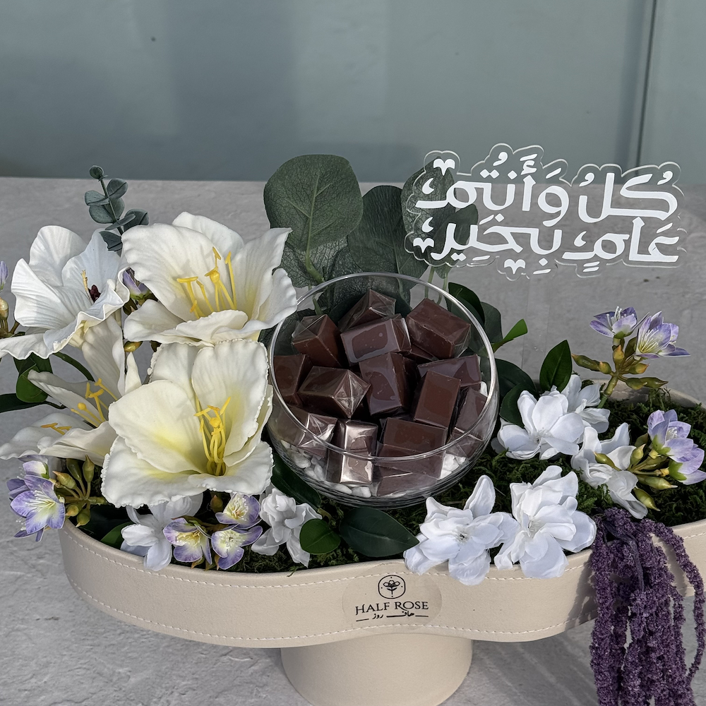 تنسيق من الزهور الصناعية على قاعدة خشبية مع الشوكولاتة البلجيكية الفاخرة.