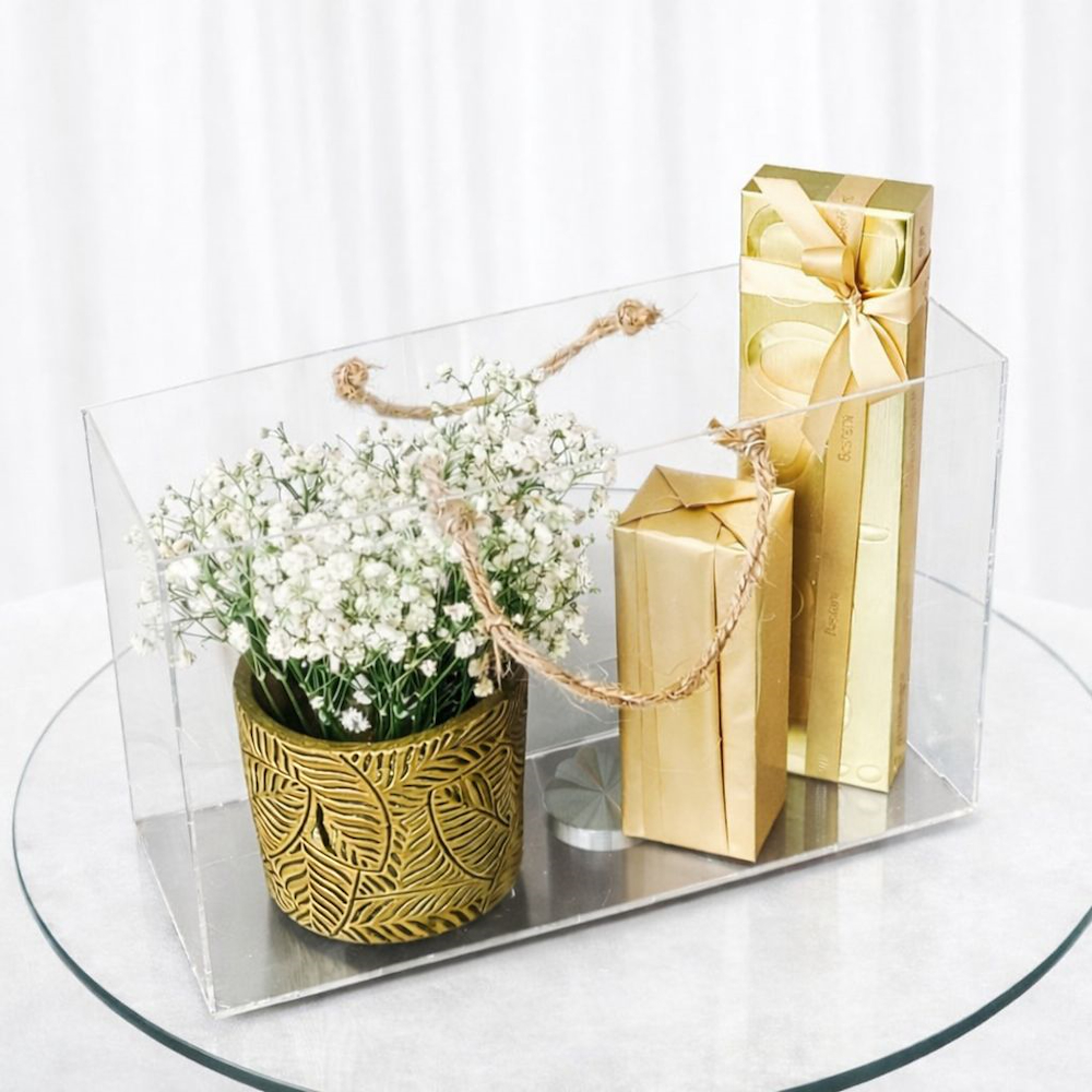 حقيبة أكريليك فاخرة بتنسيق أنيق، تحتوي على فازة أزهار الجبسوفيلا، شوكولاتة بستاني، ومبخرة إلكترونية بشحن لاسلكي.