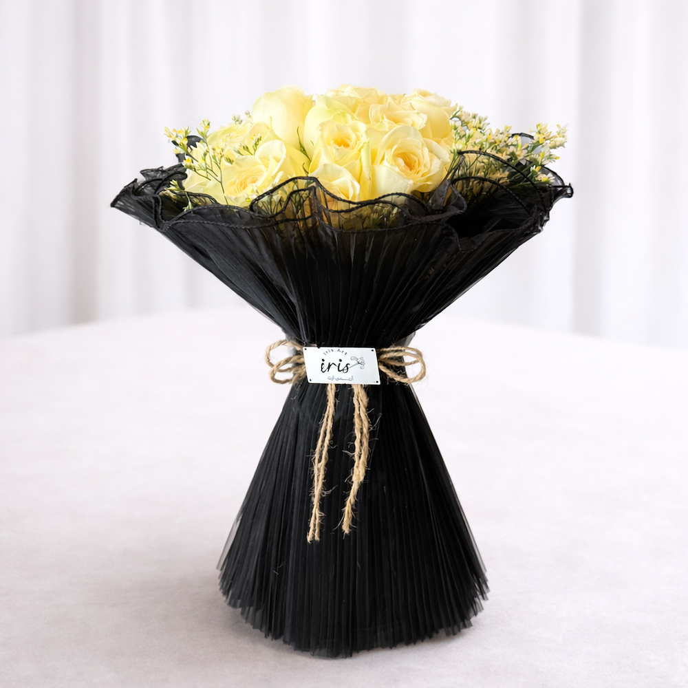 باقة جوري أنيقة بغلاف قماشي أسود ومتوسطة الحجم.