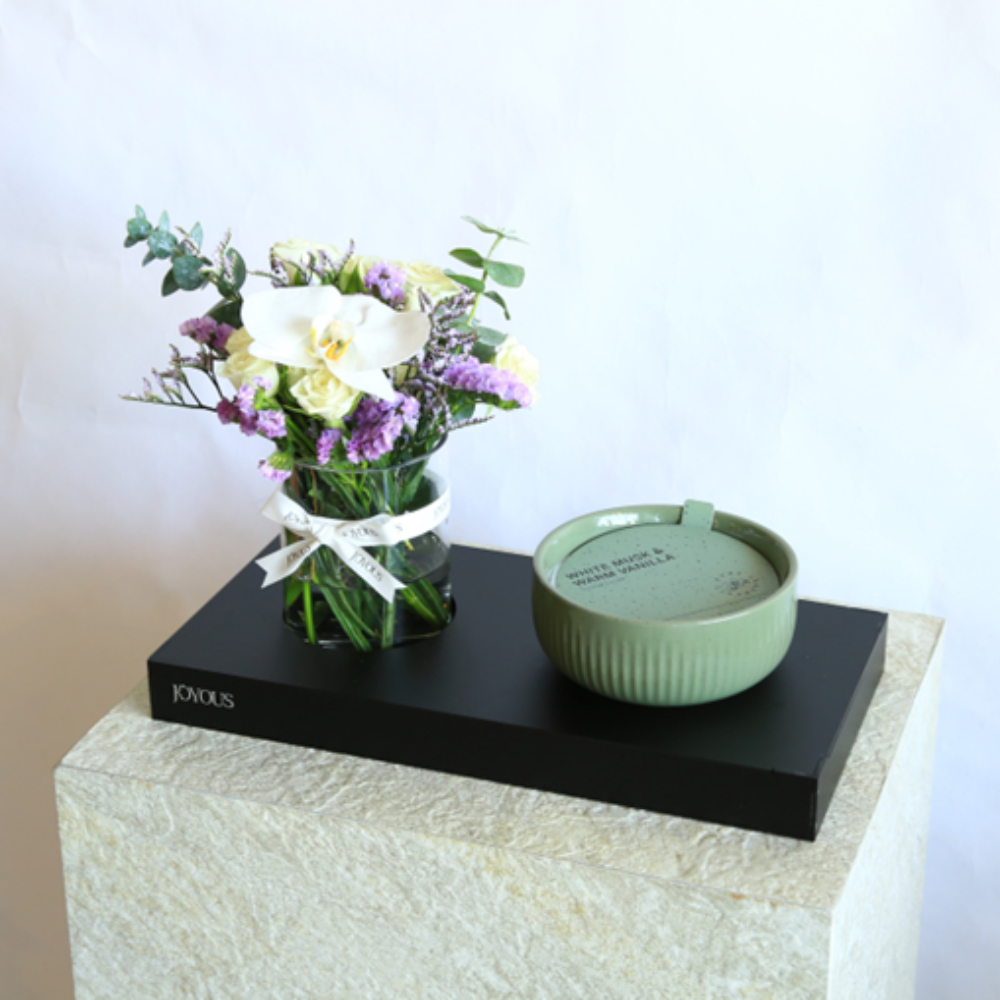 استمتع بجو من الفخامة مع هذه الشمعة الفاخرة برائحة المسك والفانيلا، الموضوعة في صينية أكريليك سوداء أنيقة. تأتي مع فازة مليئة بالورود الطبيعية، مما يجعلها هدية مثالية تضيف لمسة من الجمال والرقي لأي مناسبة.