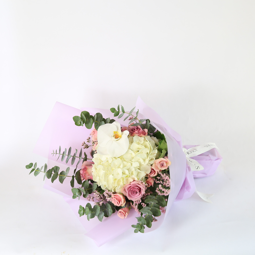 صينية اكريليك فاخرة مليئة بزهور الجوري وزهور الكرنيشن مع 24 قطعة من الشوكولاتة الفاخرة من ليفو بنكهة الكراميل فدج.