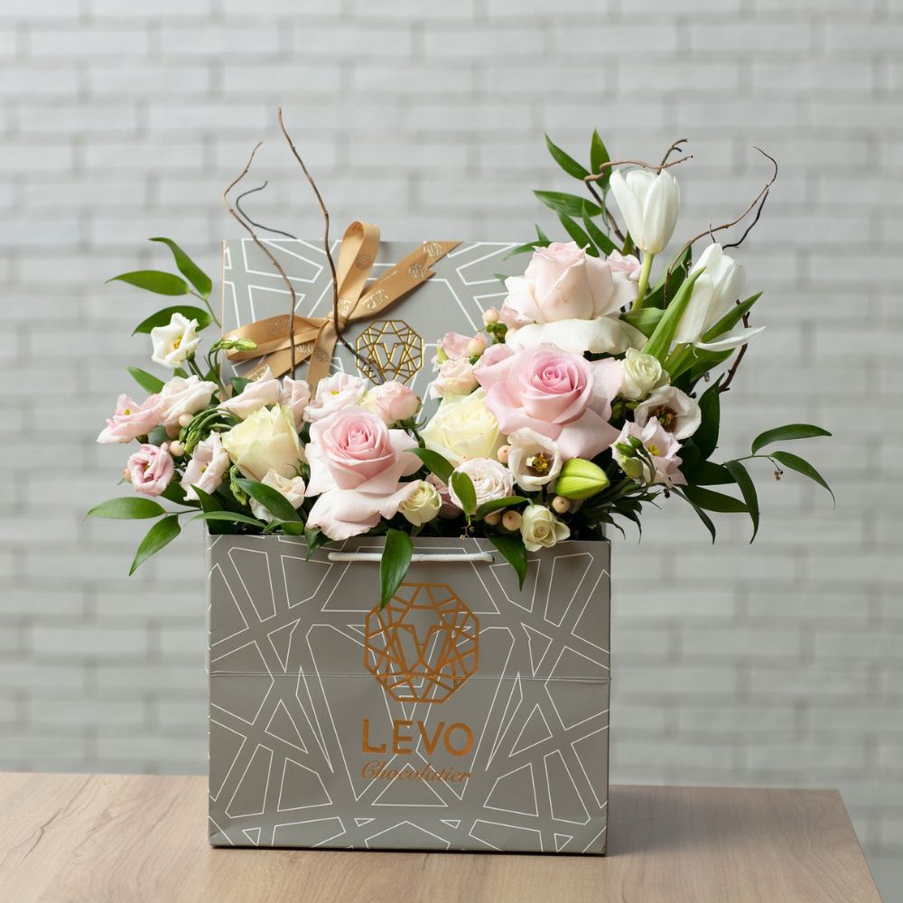 صندوق يحتوي على الجوري، البيبي جوري، التوليب والهايبريكوم مع الشوكولاتة.