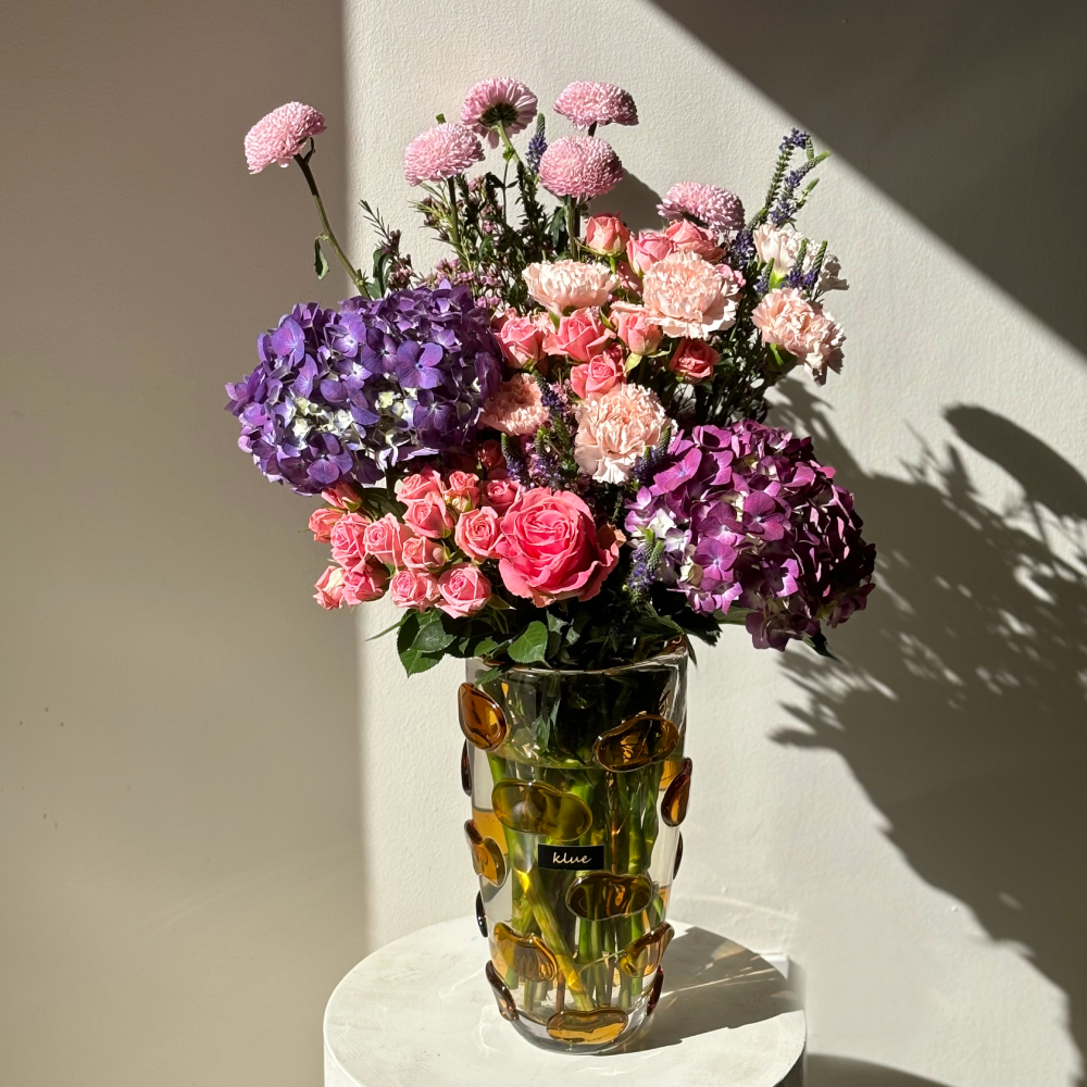 باقة تحتوي على زهور الجوري، البيبي جوري، الهايدرينجا، الكارنيشن، الكريز، الفيرونيكا وزهور الواكس، مرتبة بشكل جميل في فازة.