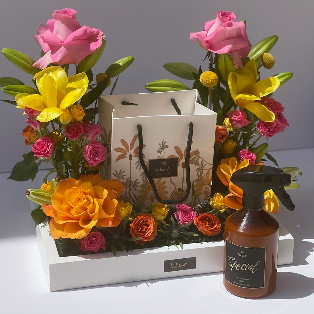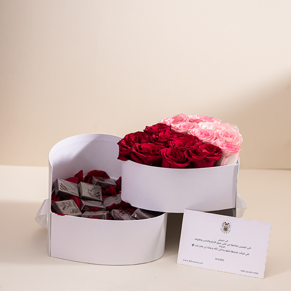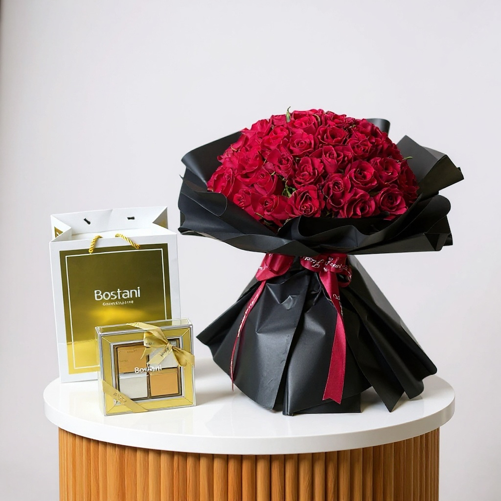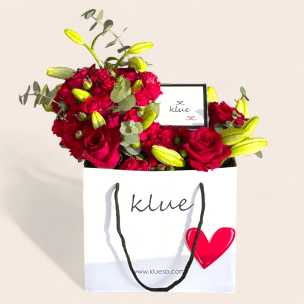 حقيبة كلو تحتوي على مجموعة من زهور الجوري وعلبة شوكولاتة. نوع الشوكولاتة: كريب الشوكولاتة. شوكولاتة بلجيكية، صنعت خصيصاً لكلو! عدد الشوكولاتة: 17 قطعة. الحجم: 25 سم * ارتفاع 35 سم.