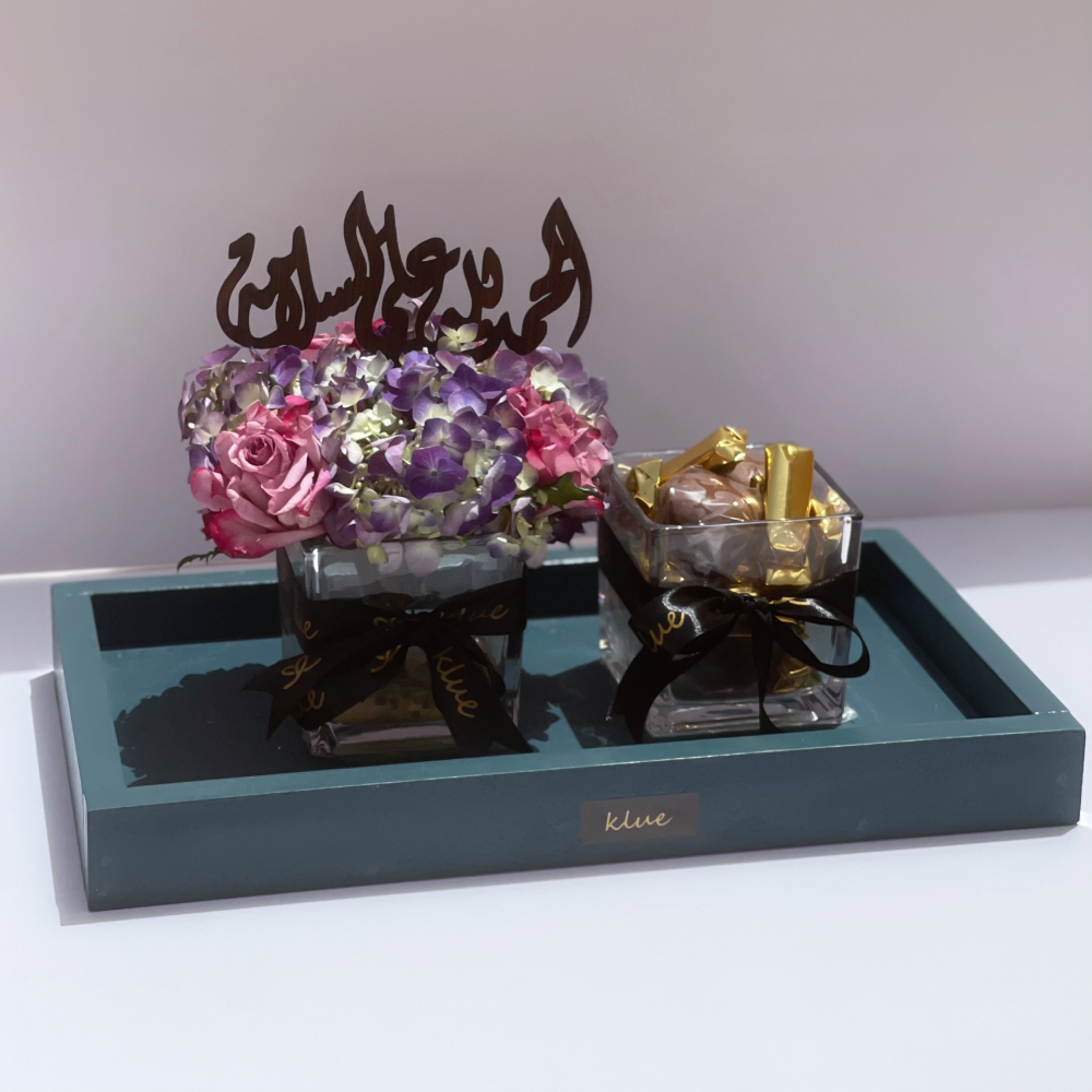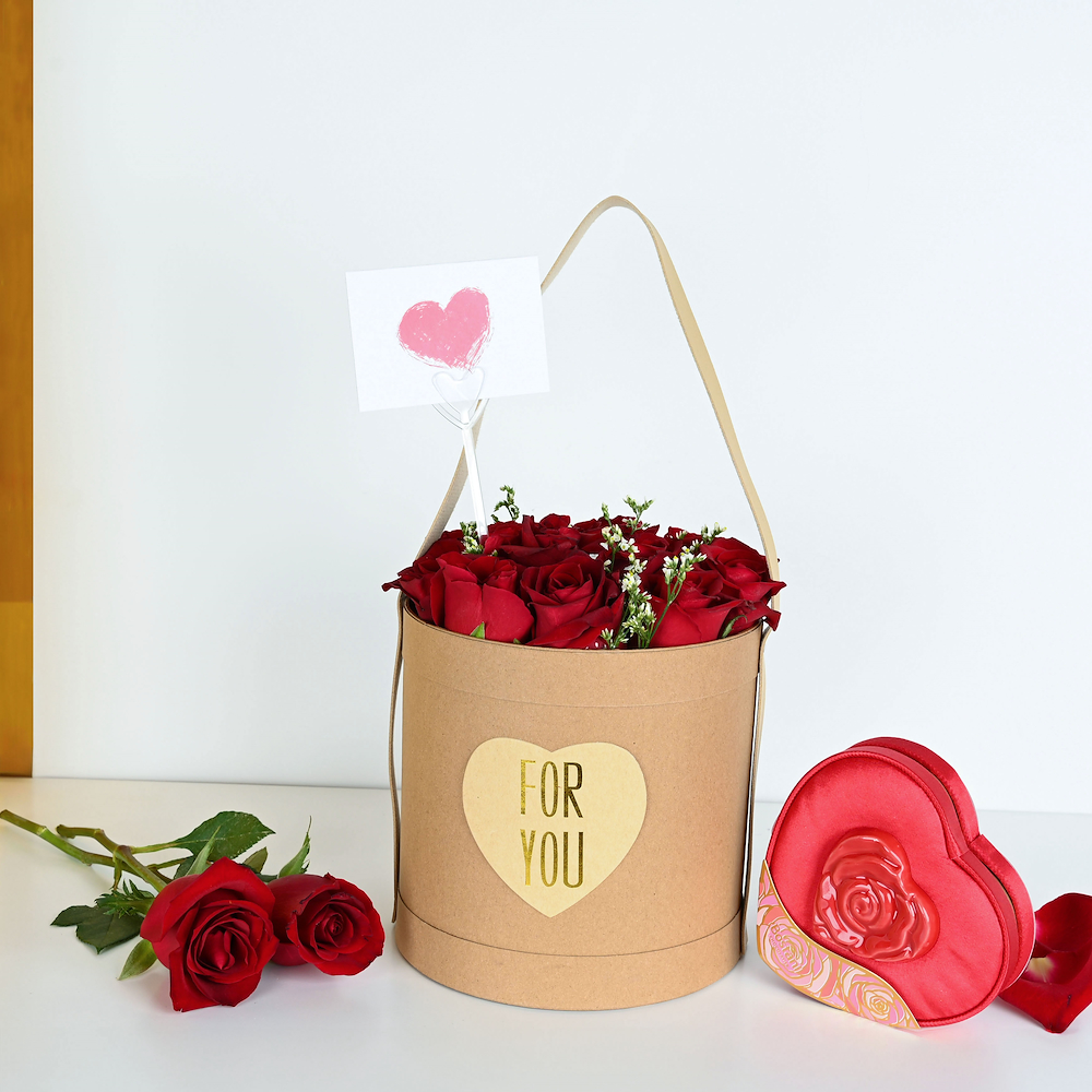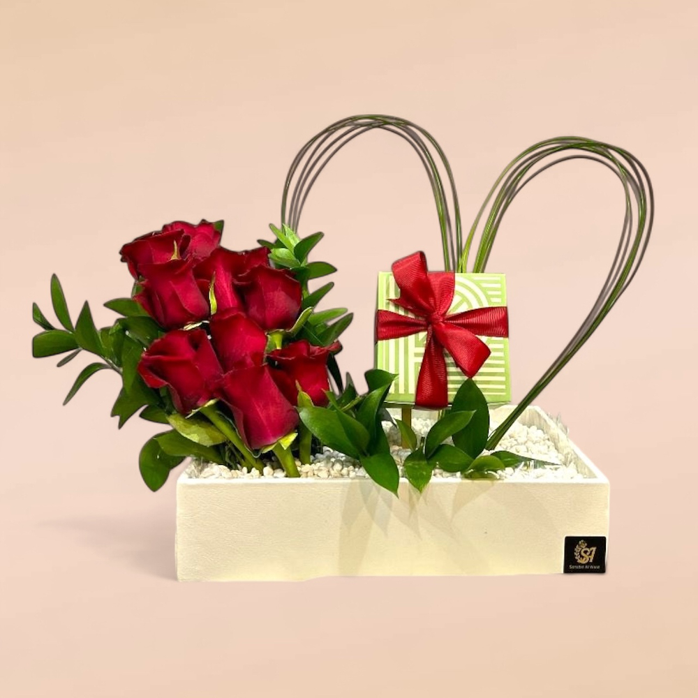 حقيبة كلو تحتوي على مجموعة من زهور الجوري وعلبة شوكولاتة. نوع الشوكولاتة: كريب الشوكولاتة. شوكولاتة بلجيكية، صنعت خصيصاً لكلو! عدد الشوكولاتة: 17 قطعة. الحجم: 25 سم * ارتفاع 35 سم.