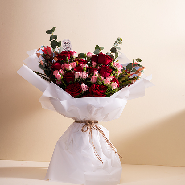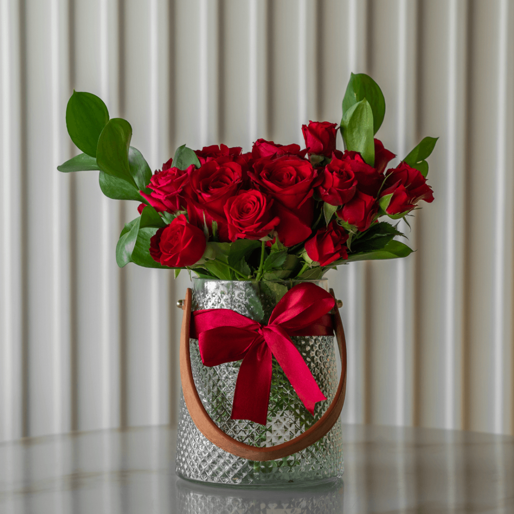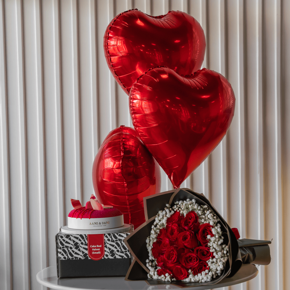 فازة جوري وكيك حجم صغير و 3 بالون هيليوم بشكل قلب مع كيك حجم صغير بنكهة الفراولة.