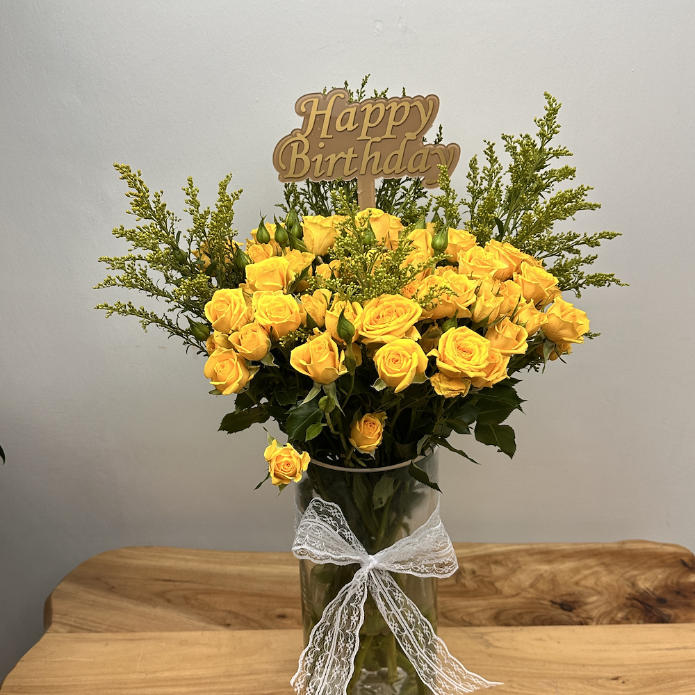 فازة شفافة مع زهور البيبي جوري الصفراء مع تغريسة من الأكريليك.
