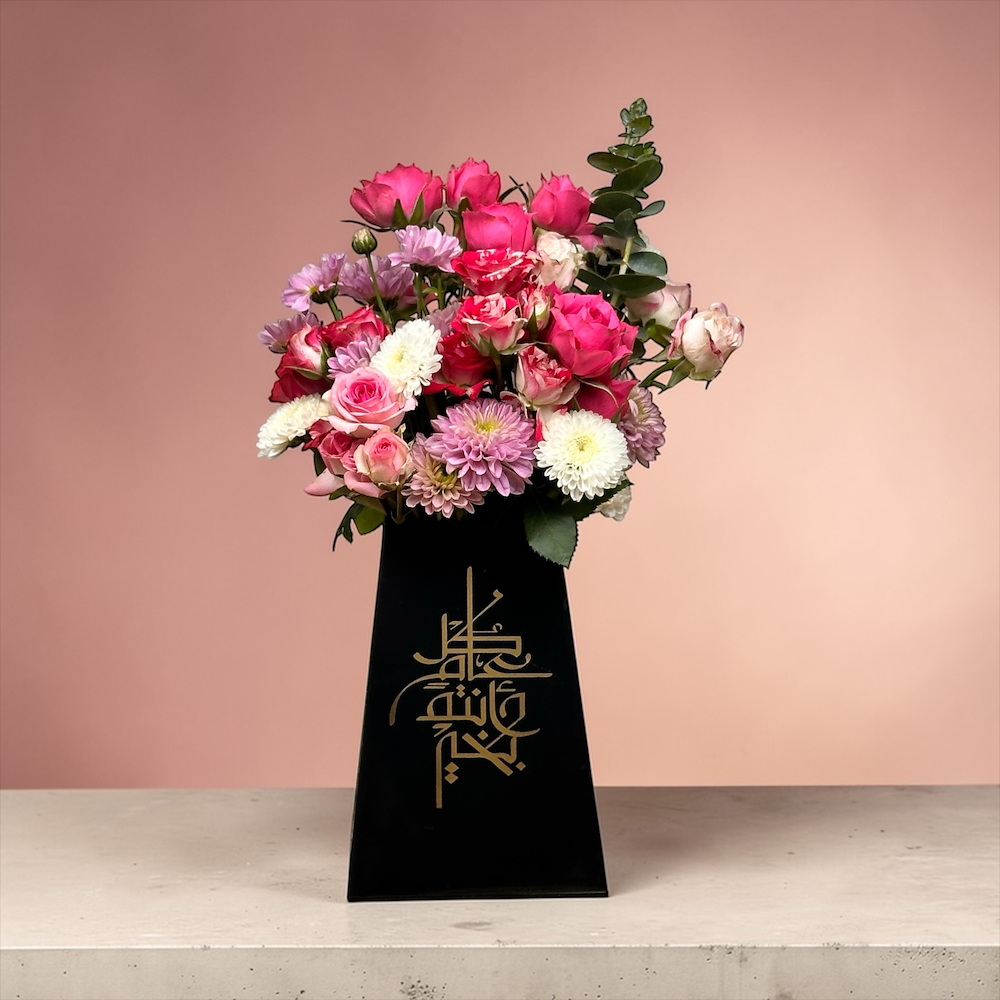 فازة من الاكريلك منسقه بالورد الطبيعي البيبي روز والكلبتوس والكريز.