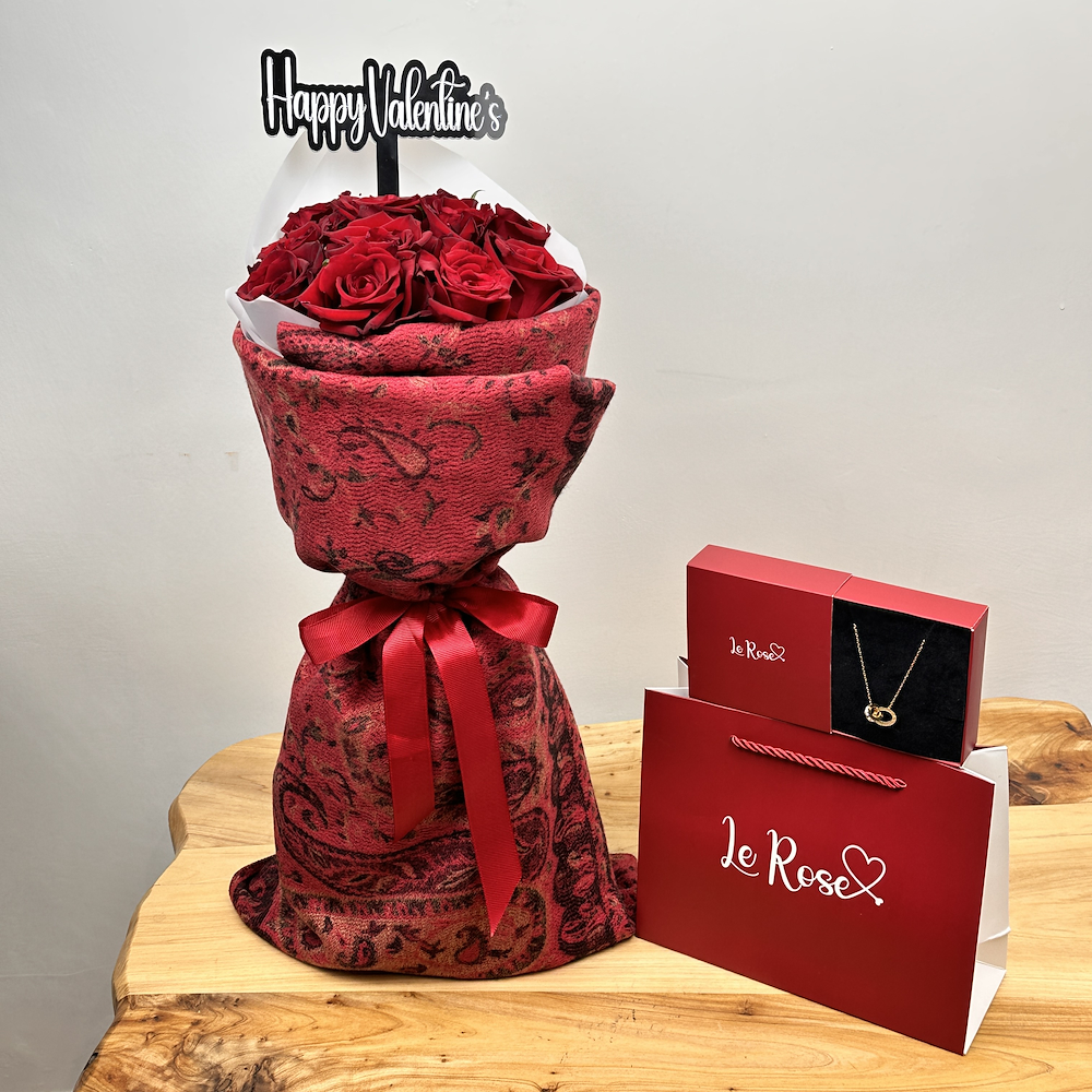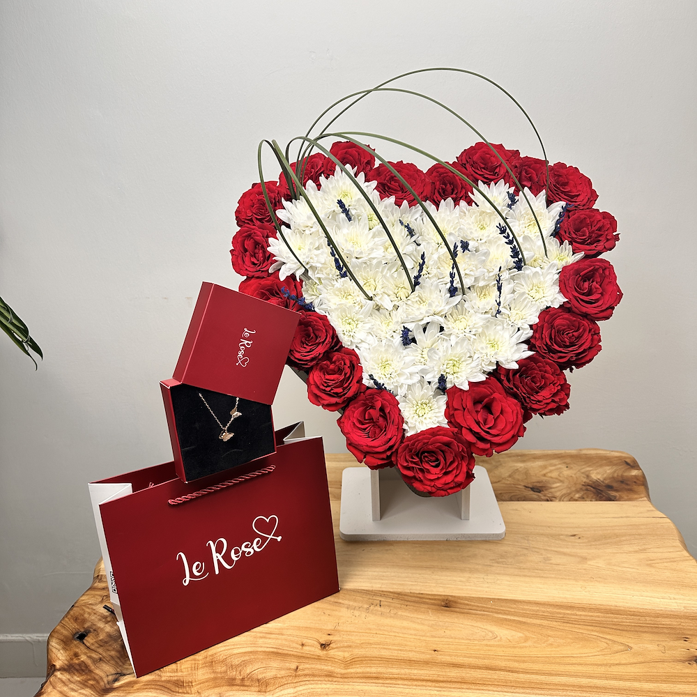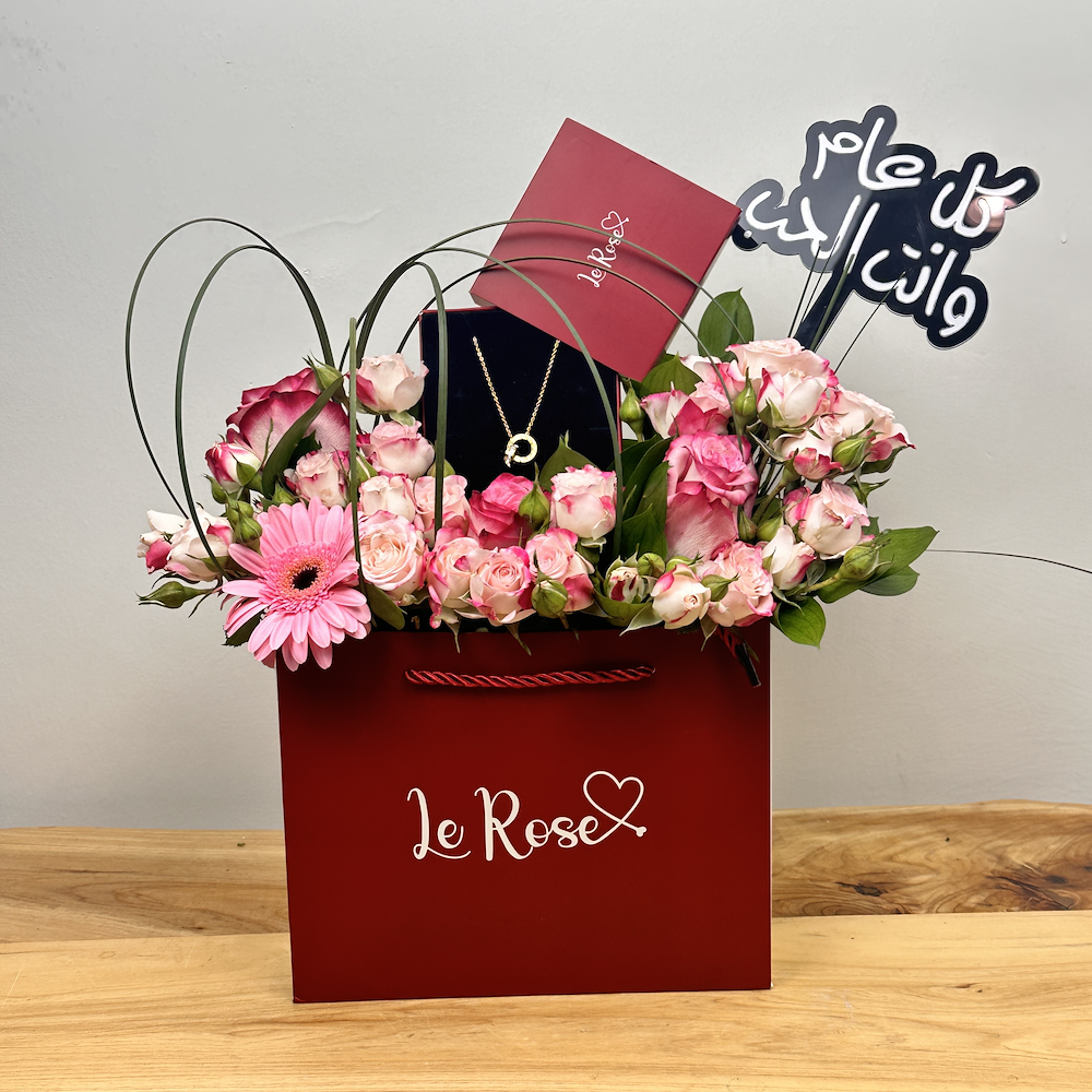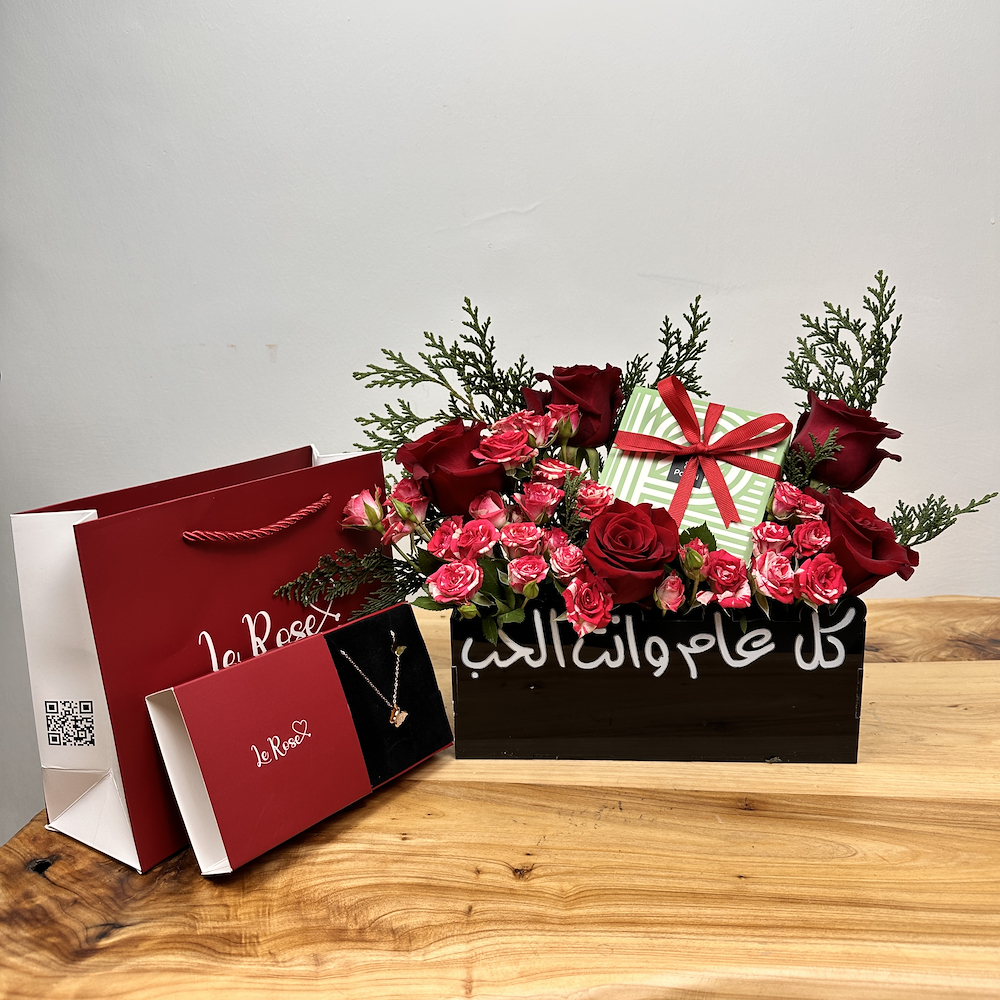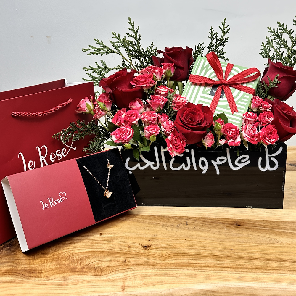 بوكس أكريليك يحتوي على أزهار الجوري والبيبي روز مع 250غ من شوكولاتة باتشي الفاخرة مع قلادة مطلية بالذهب من لي روز.