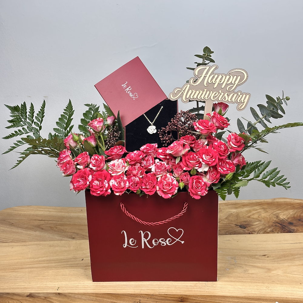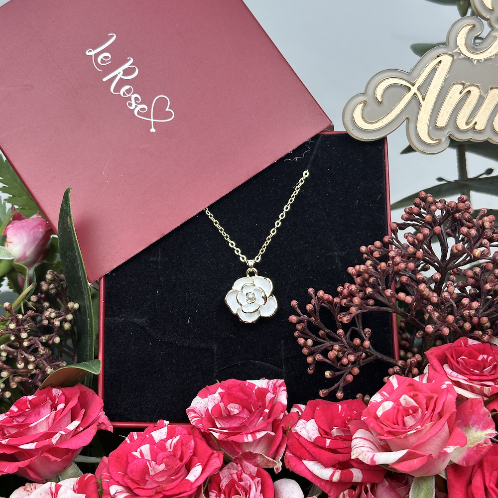 مجموعة عقد مميزة مع أزهار البيبي روز وغطاء من الأكريليك، نوع المعدن معدن مطلي بالذهب، التصميم عقد بأسلوب كوري، نوع الحجر لؤلؤ طبيعي مزروع.