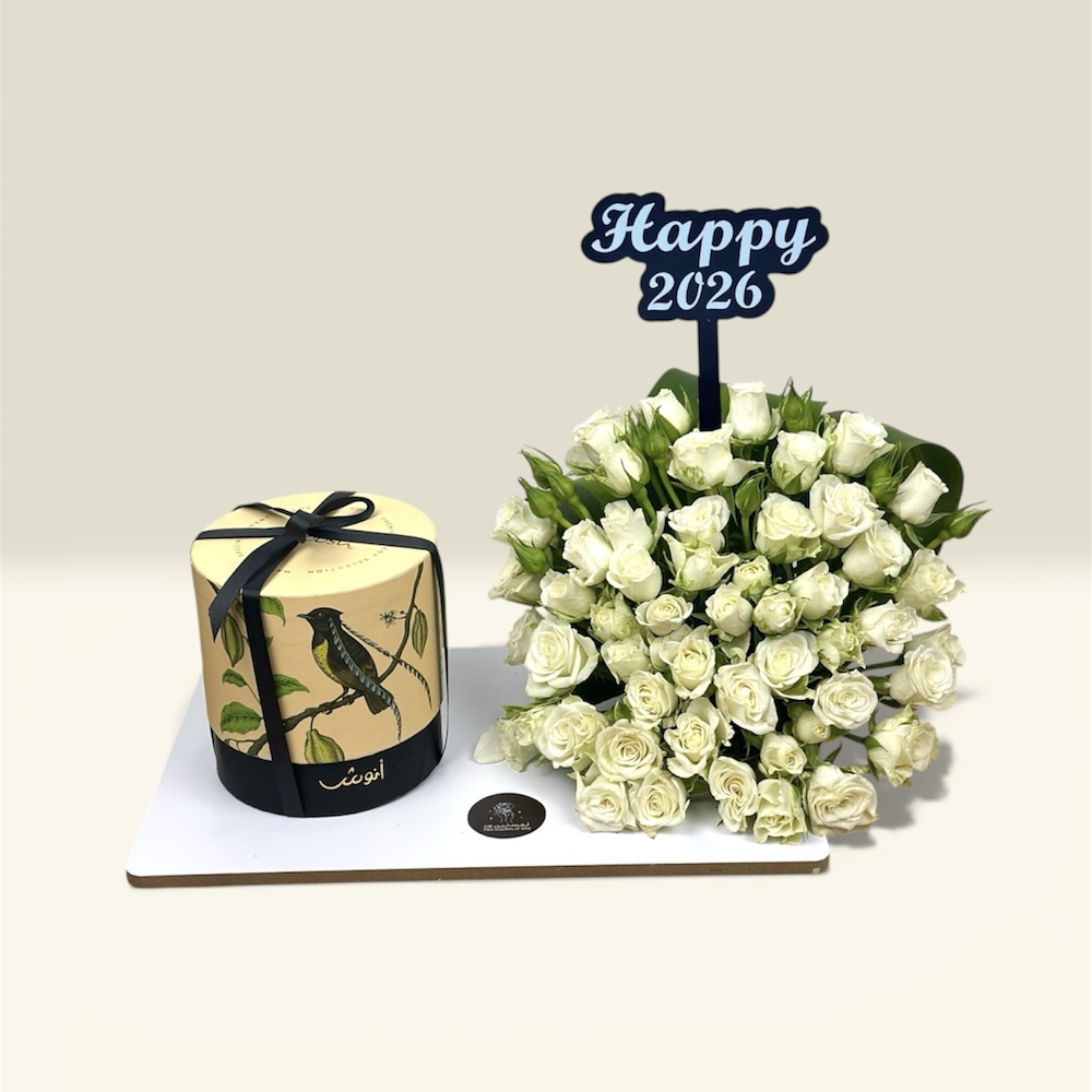 قاعدة خشبية مع زهور البيبي جوري و250 جرام من شوكولاتة الويفر من أنوش وتوبر من الأكريليك.