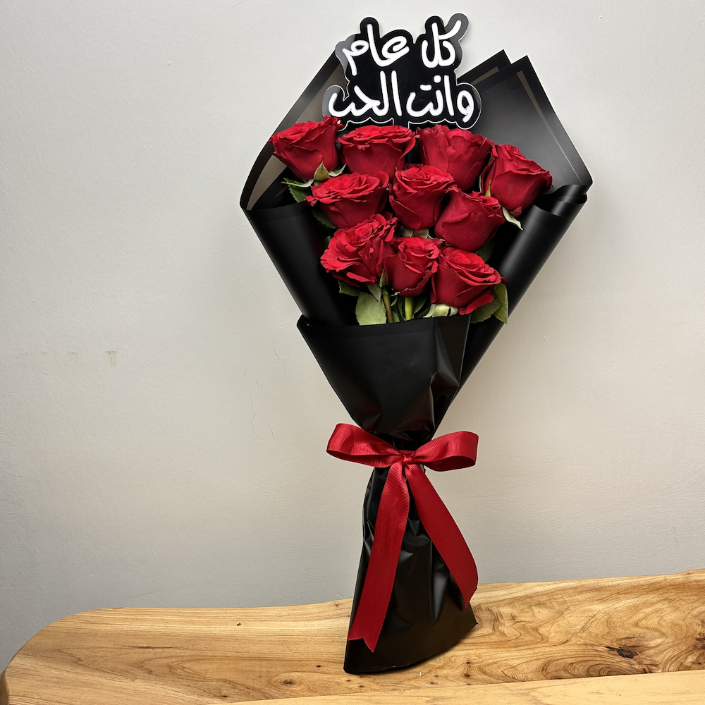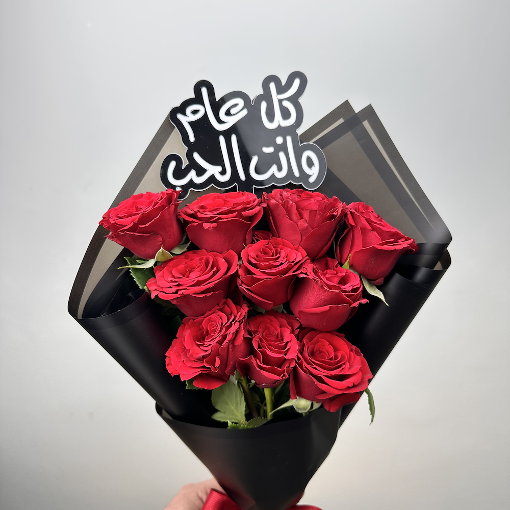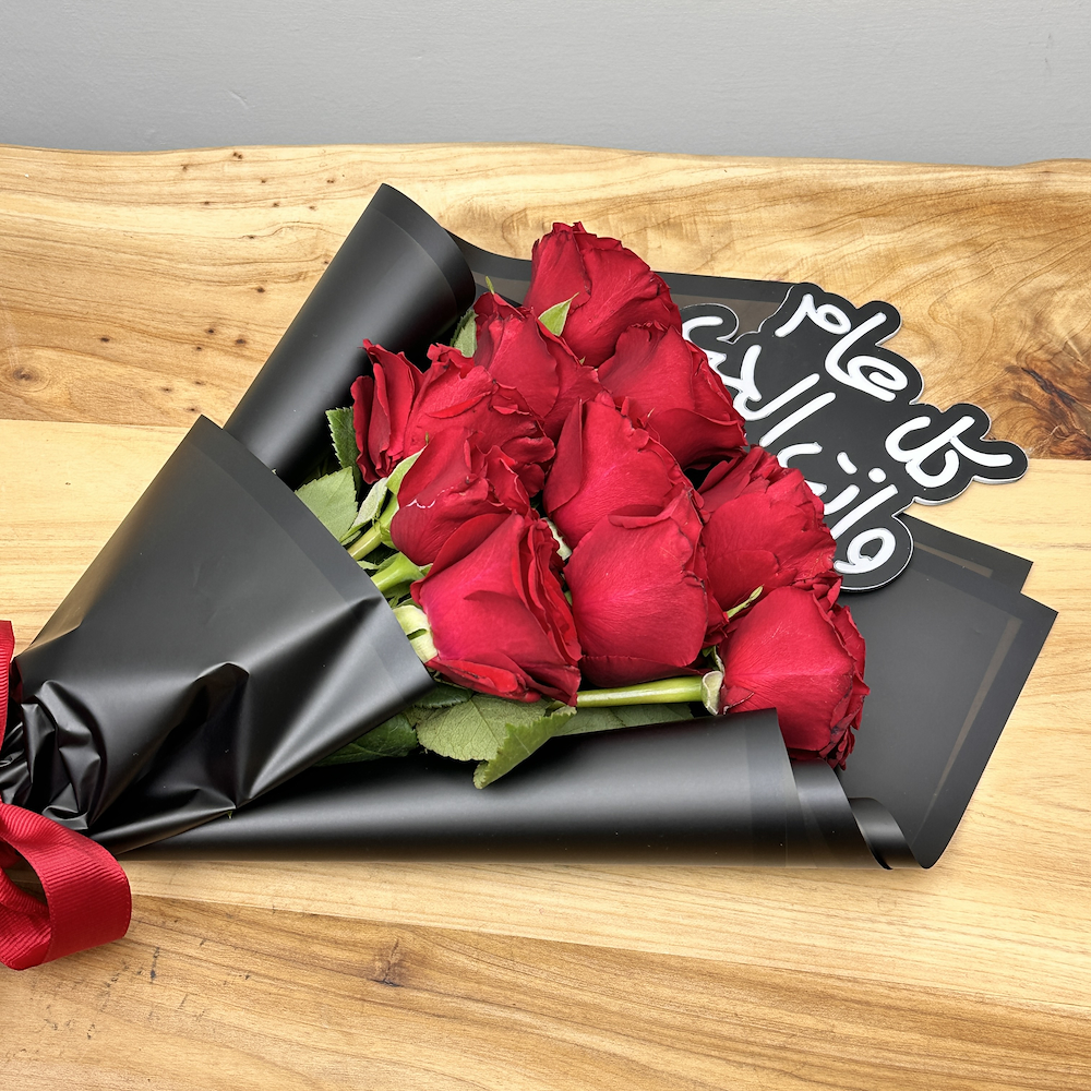 باقة تتميز بأزهار الجوري باللون الأحمر مع تغريسة أكريليك.