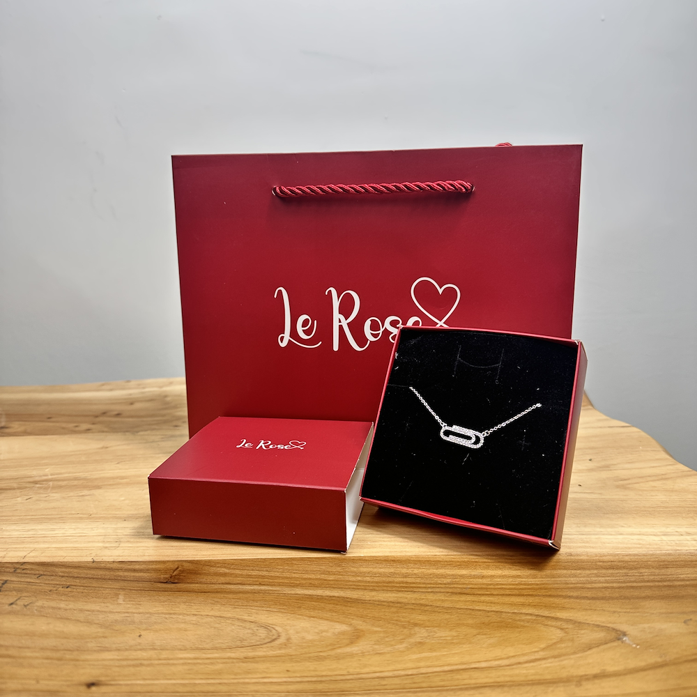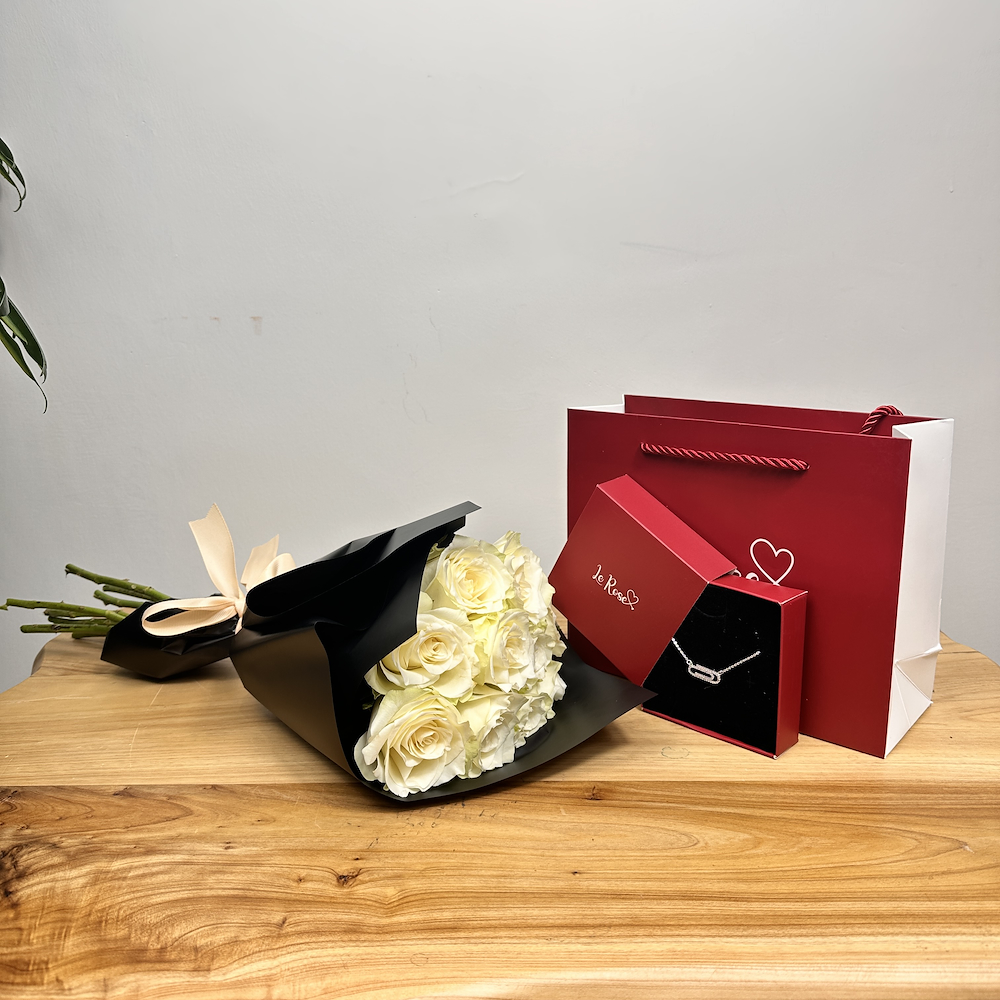 باقة يد من الجوري الأبيض، مرتبة بشكل جميل وتأتي مع قلادة مطلية بالذهب.