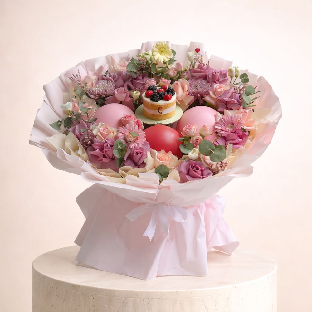 تنسيق فاخر ينبض بالنعومة والرقي، يجمع بين جمال الزهور الطبيعية ولمسة حلا راقية في تصميم مميز يخطف الأنظار. تضم الباقة مزيج متناغم من زهور الجوري الوردية بدرجاتها الحالمة مع زهور الجيربيرا والكريز الرقيقة ولمسات من الزهور الموسمية، تتخللها أوراق خضراء منعشة تضفي حيوية وأناقة على الترتيب.