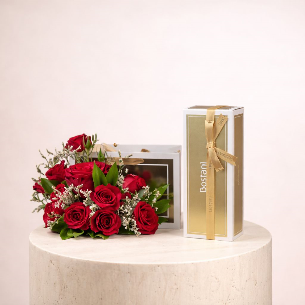 حقيبة مزينة بأزهار الجوري وشوكولاتة بستاني. باقة تجسد البساطة والرقي بكل معانيهما.