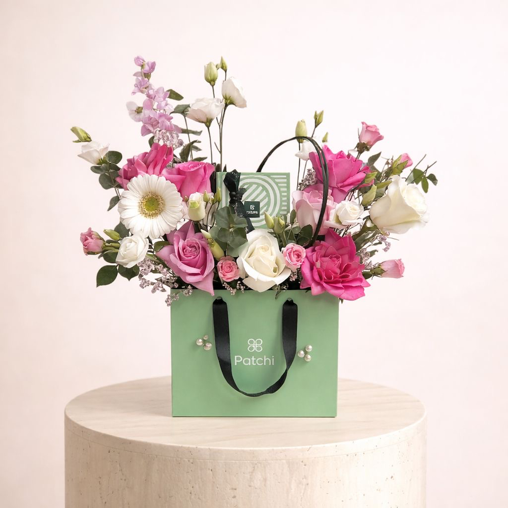 حقيبة جميلة تتميز بأزهار الجوري، بيبي روز والجربيرا مع شوكولاتة باتشي.
