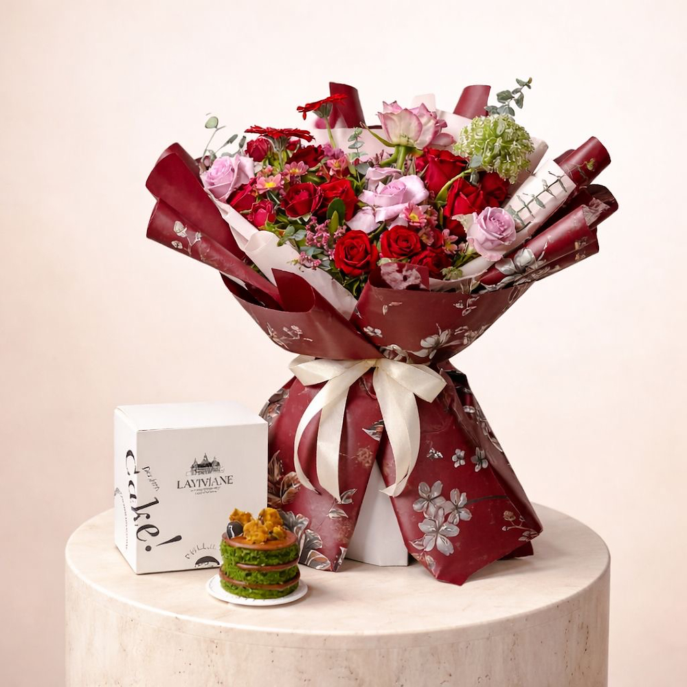 باقة أنيقة مليئة بأزهار الجوري والبيبي روز مع كيكة صغيرة من لافيفيان.