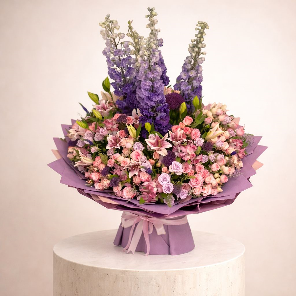 بوكيه فاخر ينبض بالرقي والجمال، بتنسيق مميز يجمع بين درجات البنفسجي الحالمة والوردي الناعم في تناغم أنيق يلفت الأنظار. تتصدره زهور طويلة باللون البنفسجي تعطيه حضورًا مهيبًا ولمسة درامية راقية، تحيط بها باقة غنية من الورود الوردية الصغيرة وزهور الليليوم الرقيقة، مع لمسات خضراء منعشة تضيف حيوية للتصميم.