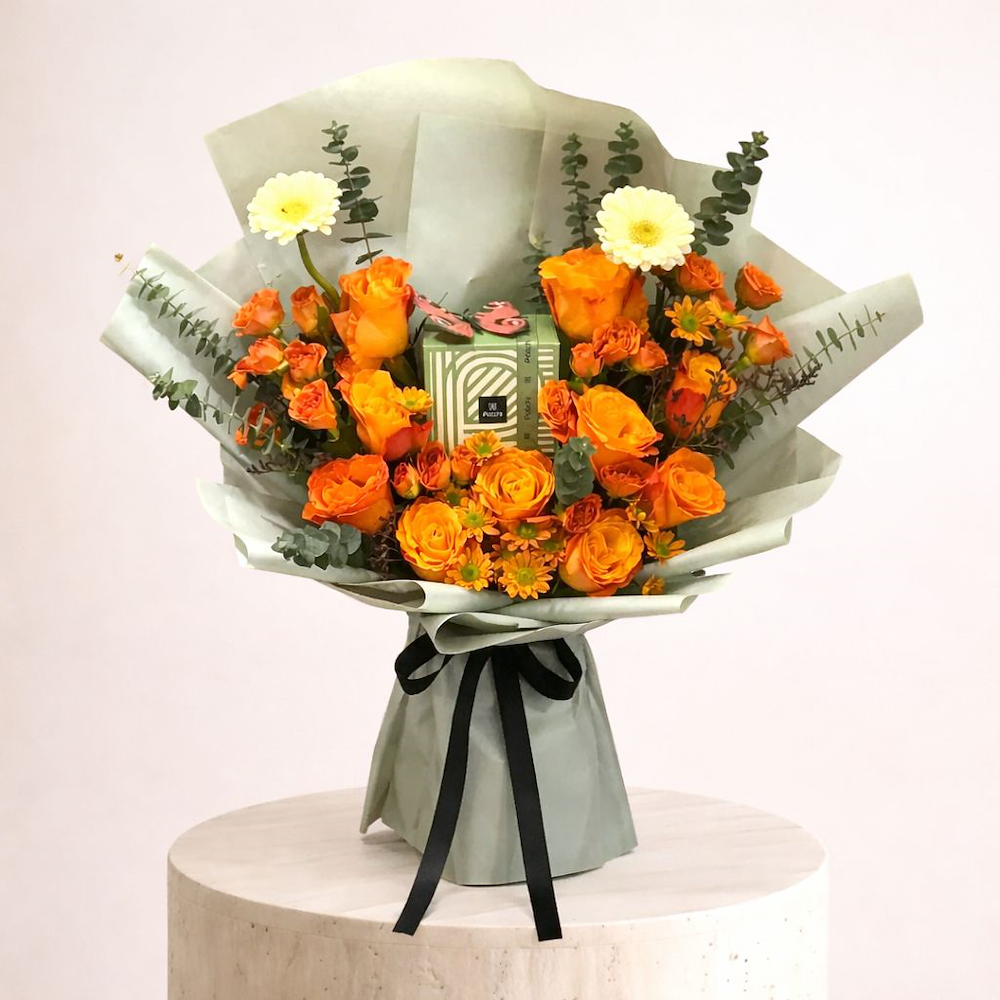 باقة نابضة بدرجات اللون البرتقالي الدافئة، تضم زهور الجوري، البيبي جوري، الجيربيرا والكريز مع شوكولاتة فاخرة من باتشي. صممت بعناية لتكون أكثر من مجرد هدية، فهي مزيج مثالي من الجمال البصري ومتعة المذاق. مثالية للإحتفالات، والتخرج، أو للتعبير عن التقدير والإمتنان.