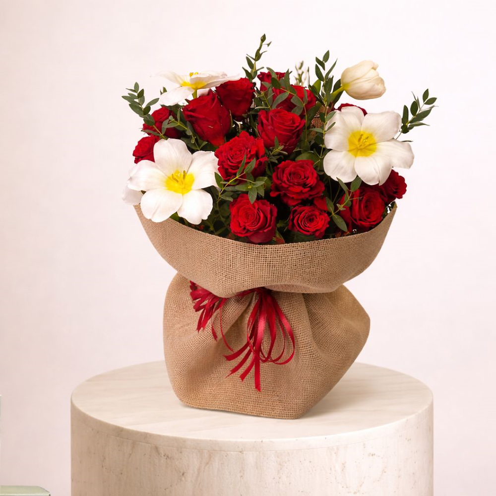 تجمع هذه الباقة بين كلاسيكية الجوري الأحمر القاني الذي يرمز للمشاعر العميقة، وبين الزهور البيضاء المتفتحة (الزنبق أو التوليب) التي تضفي لمسة من النقاء والهدوء. تم تنسيقها بعناية مع أوراق الأوكالبتوس الخضراء لإضافة حيوية وشكل طبيعي يكسر حدة الألوان.