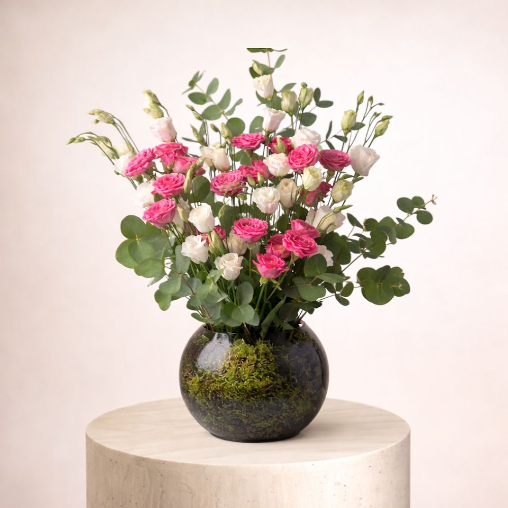 فازة أنيقة تتميز بأزهار البيبي روز والليسيانتوس.