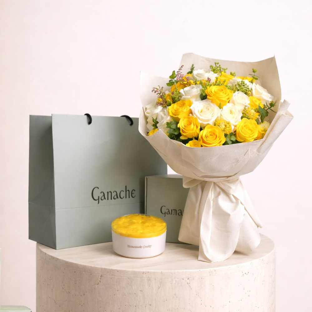 هذا التنسيق يجمع بين الأناقة والبهجة، وهو مثالي للإهداء في مناسبات النجاح، التخرج، أو التهنئة بسلامة شخص عزيز من إشراقة غاناش استمتع بمزيج ساحر يجمع بين جمال الطبيعة ولذة الحلويات الفاخرة. صُممت هذه المجموعة لتكون رسالة حب وتقدير تفيض بالحيوية والأناقة، يحتوي الزهور وكيكة.