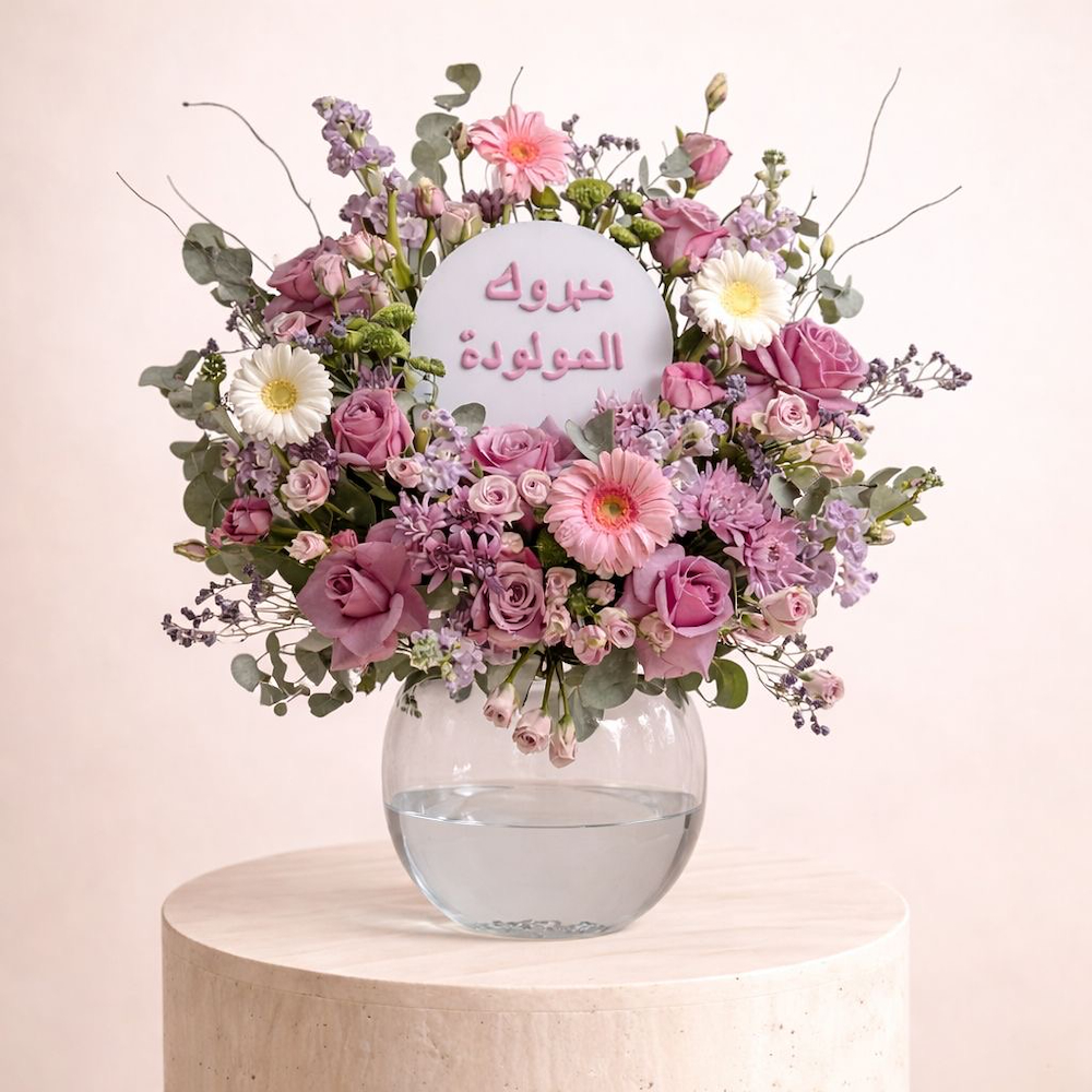 فازة أنيقة مليئة بأزهار الجوري، البيبي روز والجربيرا مع تغريسة.