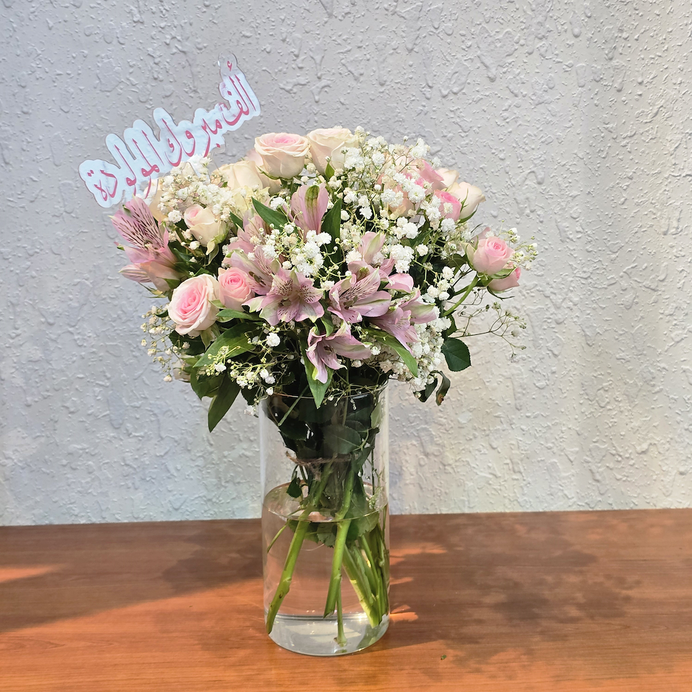 باقة زهور تضم زهور الجوري، البيبي جوري، الجبسوفيلا والألستروميريا، مرتبة بشكل جميل في فازة. باقة رائعة للترحيب بالمولود الجديد.