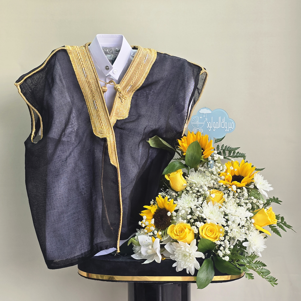 باقة زهور تضم زهور الجوري، الكريز، الجبسوفيلا وعباد الشمس، مرتبة بشكل جميل في ستاند مخملي. تأتي مع بشت وثوب سعودي.