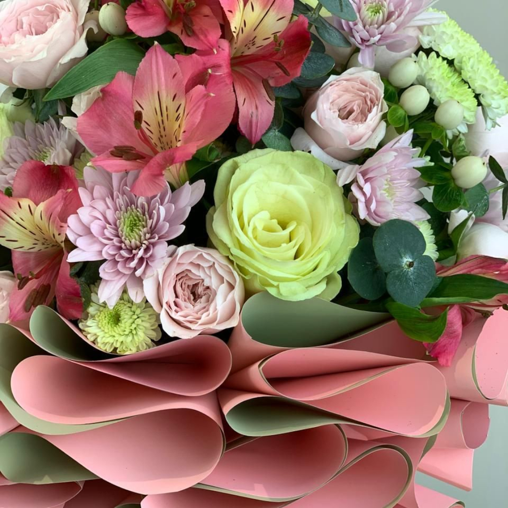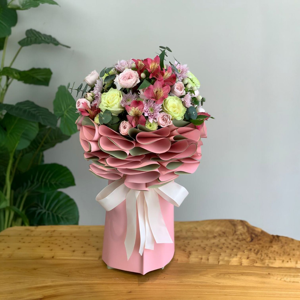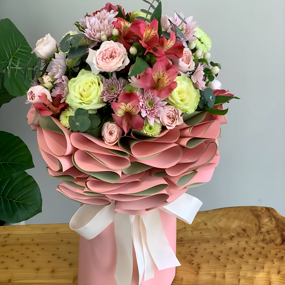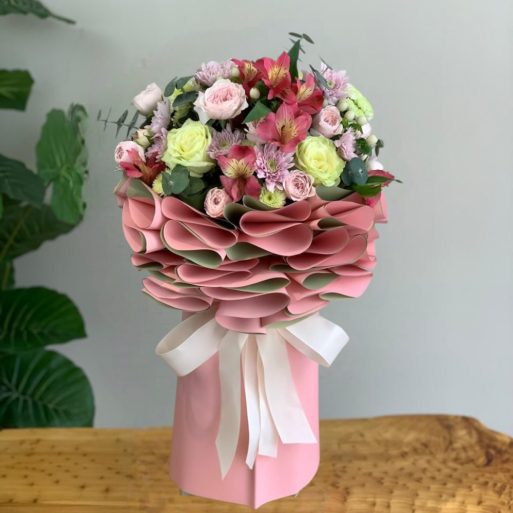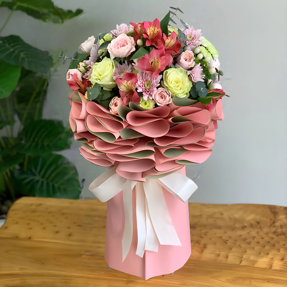 باقة يد أنيقة بأزهار البيبي روز، الجوري، الكريز والسترومريا.