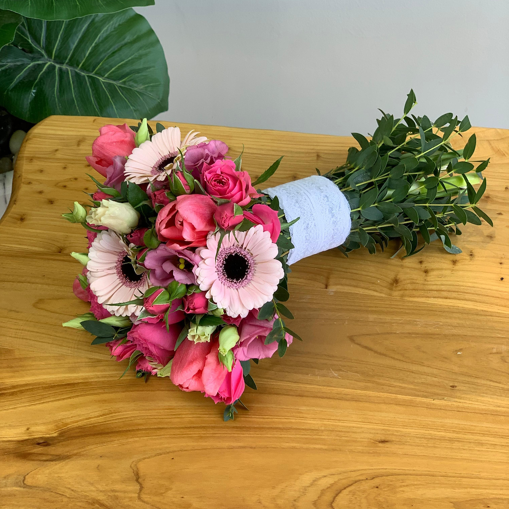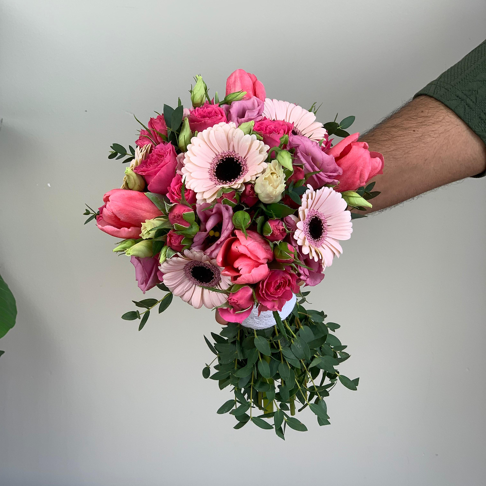 باقة أنيقة تتميز بأزهار الجوري والكريز بدرجات اللون الوردي.
