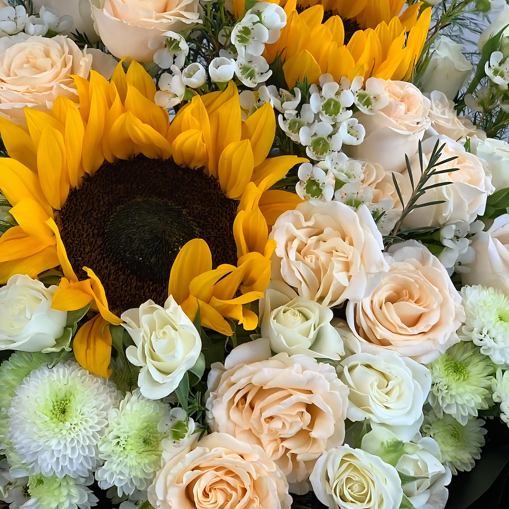 باقة يد أنيقة بأزهار البيبي روز ودوار الشمس والواكس.