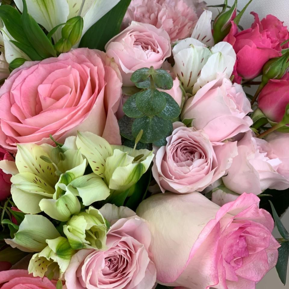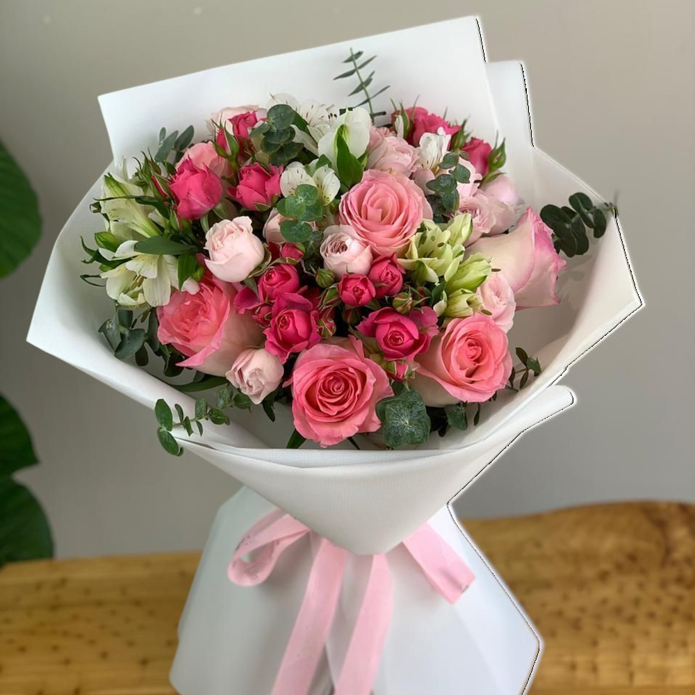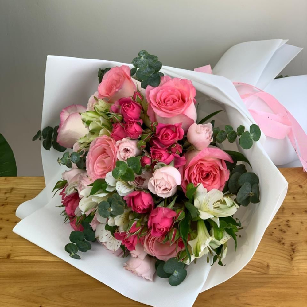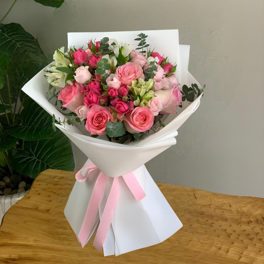 باقة أنيقة مليئة بأزهار الجوري، دوار الشمس، الكريزانتم والسترومريا الهولندية مع أوراق الأوكالبتوس بتصميم يمنح إطلالة فاخرة ومبهجة.