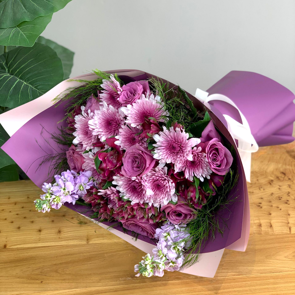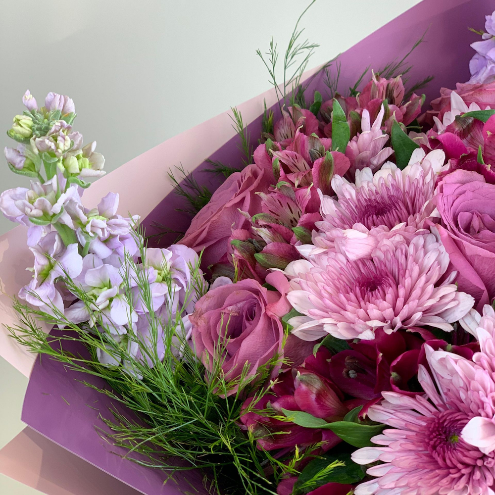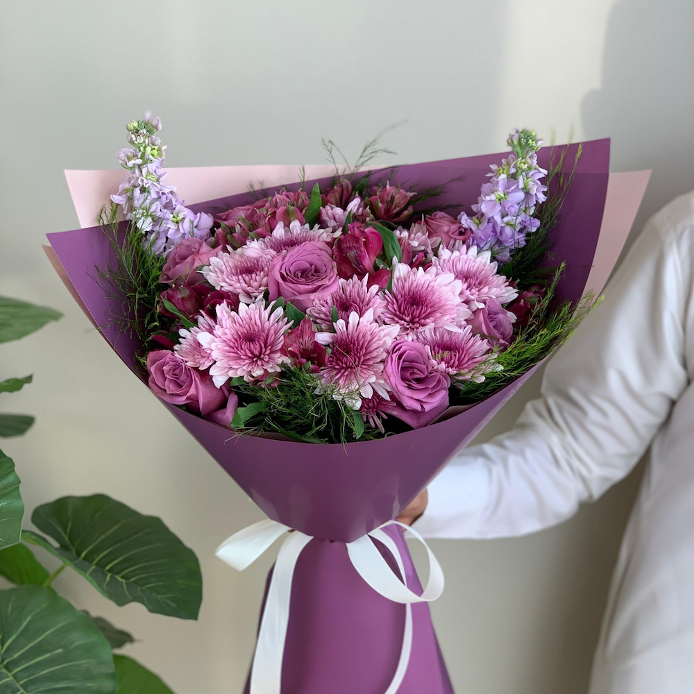 باقة أنيقة مليئة بأزهار الجوري الهولندي، الكريز والسترومريا الكينية.