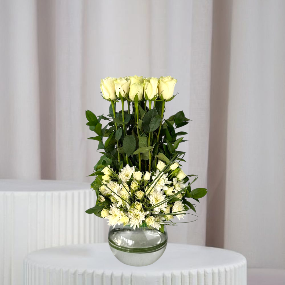 فازة أنيقة مليئة بأزهار الكريزانتم، الجوري والبيبي روز بتصميم يمنح إطلالة راقية وجميلة.