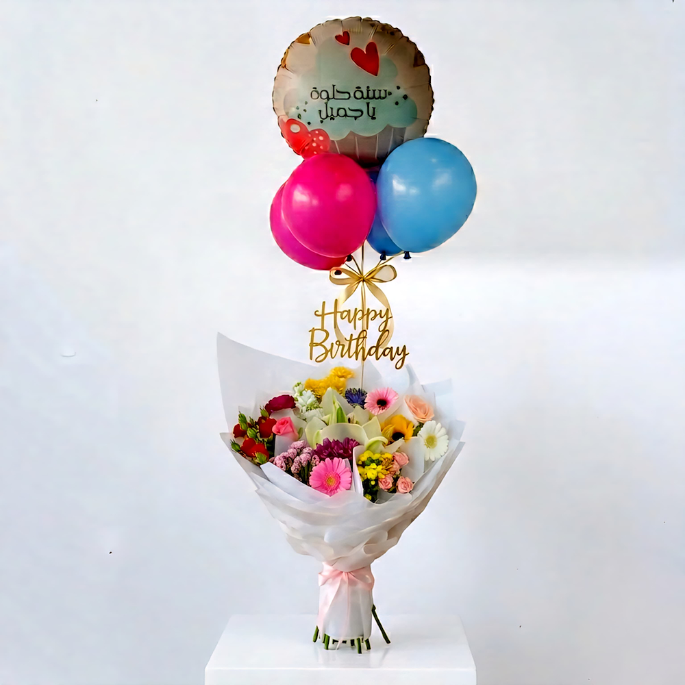 باقة زهور ملونة تحتوي على الجوري، الجيربيرا والليليز مع البالونات وتغريسة الميلاد.
