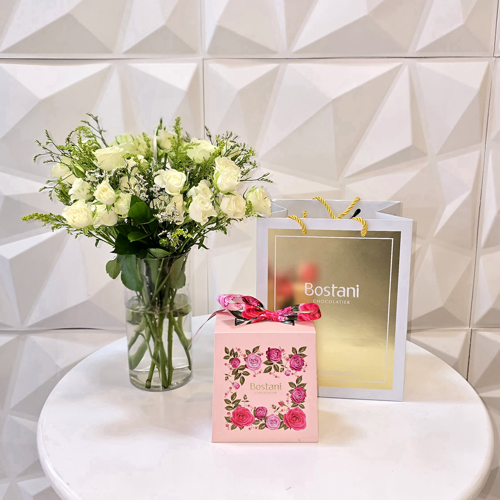 باقة تحتوي على زهور البيبي جوري البيضاء، مرتبة بشكل جميل في فازة. تأتي مع علبة شوكولاتة من بستاني.