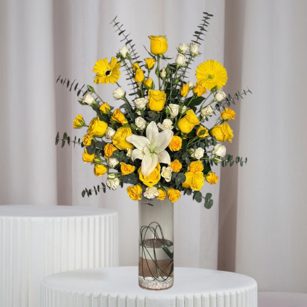 فازة أنيقة مليئة بأزهار الجوري، الليليز والبيبي روز مع أوراق الأوكالبتوس بتصميم يمنح إطلالة منعشة وراقية.